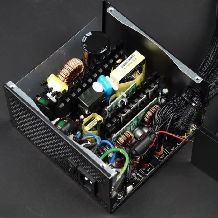 Основные полупроводниковые элементы установлены на двух компактных радиаторах с небольшим оребрением. Независимые источники +3.3VDC и 5VDC установлены на дочерней печатной плате и, по традиции, дополнительных теплоотводов не имеют — это вполне типично для блоков питания с активным охлаждением. В блоке питания преимущественно установлены конденсаторы марки Teapo, но также имеется небольшое количество конденсаторов Nippon Chemi-Con серии KY, а также большое количество полимерных конденсаторов.