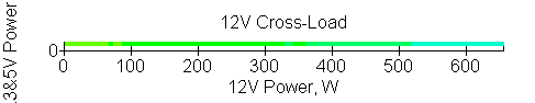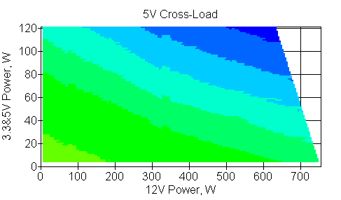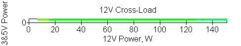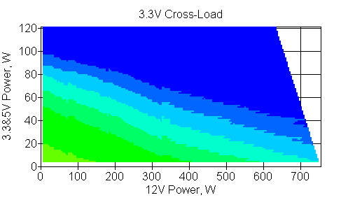 Следующим этапом инструментального тестирования является построение кросснагрузочной характеристики (КНХ) и представление ее на четвертьплоскости, ограниченной максимальной мощностью по шине 3,3&5 В с одной стороны (по оси ординат) и максимальной мощностью по шине 12 В с другой (по оси абсцисс). В каждой точке измеренное значение напряжения обозначается цветовым маркером в зависимости от отклонения от номинального значения.