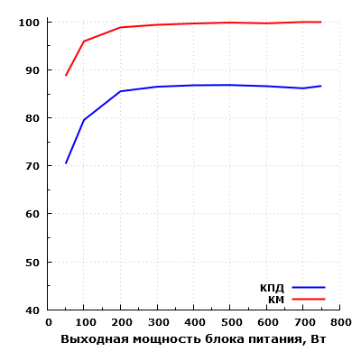 Эффективность БП находится на среднем уровне. Согласно нашим измерениям, КПД данного блока питания достигает значения свыше 86% в диапазоне мощности от 300 до 750 ватт, максимальное зарегистрированное значение составило около 86,9% на мощности 500 Вт. Одновременно с этим, КПД на мощности 50 Вт составил около 70,4%.