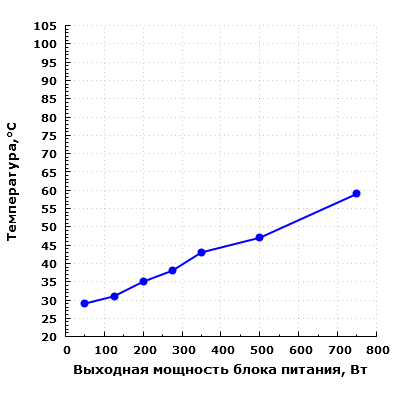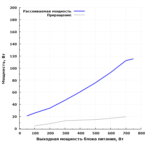 Экономичность модели находится на хорошем уровне: на максимальной мощности БП рассеивает около 115 Вт, 60 Вт он рассеивает на мощности порядка 390 Вт, а 100 Вт — при мощности нагрузки около 640 Вт. На мощности 50 Вт блок питания рассеивает около 21 Вт.