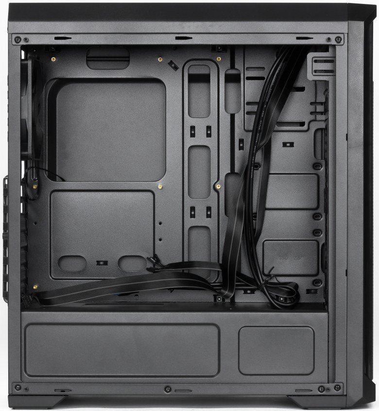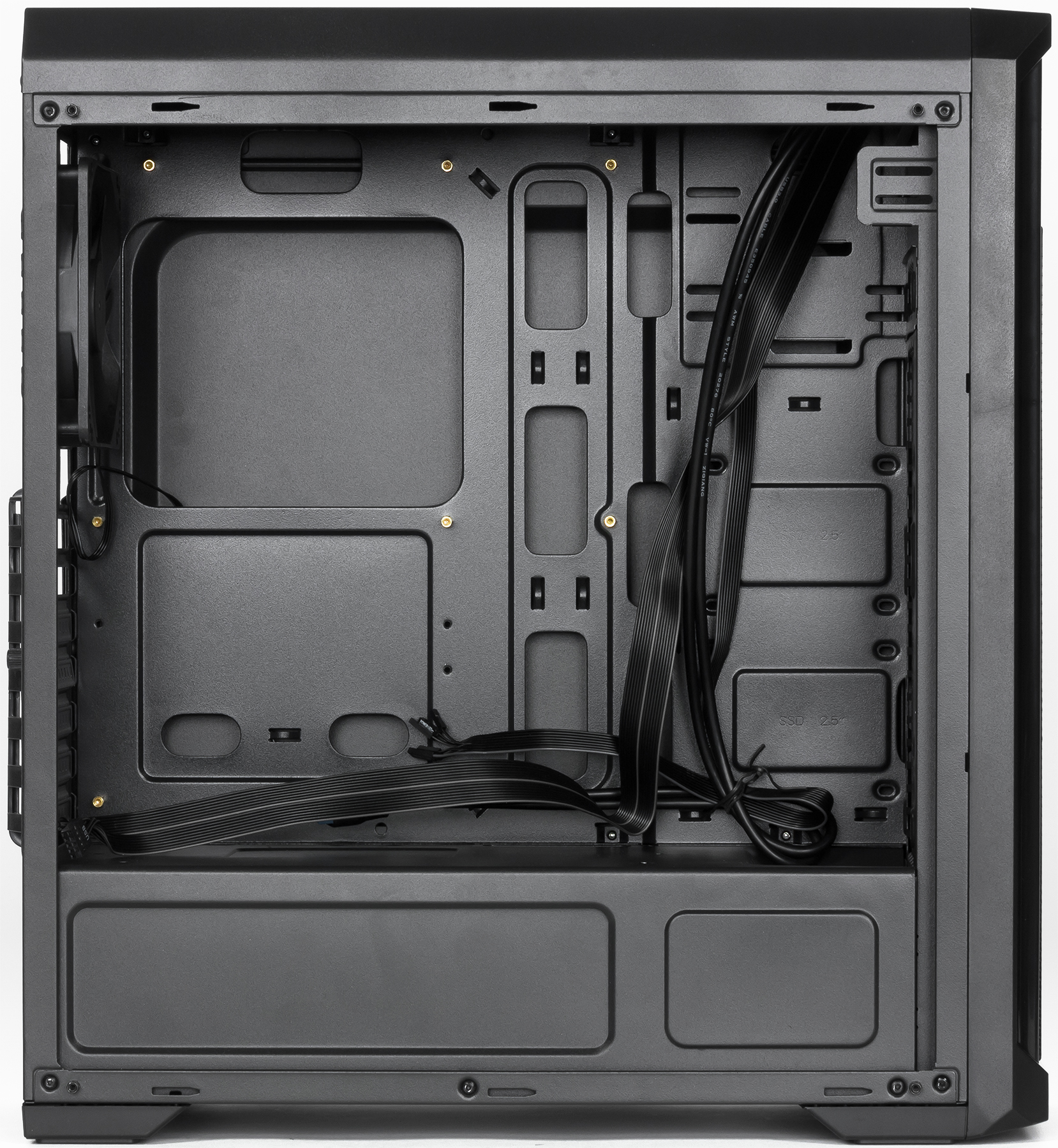 Для прокладки проводов и кабелей в перегородке отсека для БП и в основании системной платы предусмотрены отверстия. Как и в других недорогих корпусах, резиновых заглушек с разрезными лепестками в них нет. Провода питания можно проложить и справа, где у нижнего отсека нет стенки.