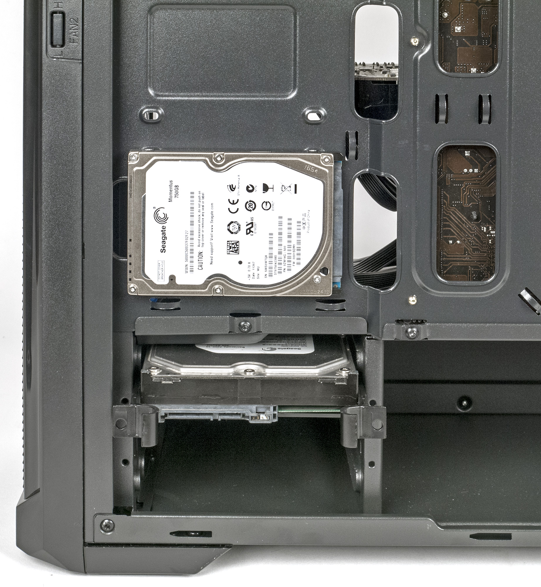 Под этими посадочными местами в нижнем отсеке имеется дисковая стойка, вмещающая два накопителя на универсальных (то есть рассчитанных на обе размерности HDD/SSD) салазках. Диски 3,5″ фиксируются в салазках боковыми штифтами, причем вполне прочно — приходится приложить немалое усилие, чтобы дослать накопитель на место. Специальных амортизаторов нет, разве что до некоторой степени их роль сыграет сам пластик салазок. 2,5-дюймовые накопители крепятся винтами снизу.