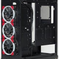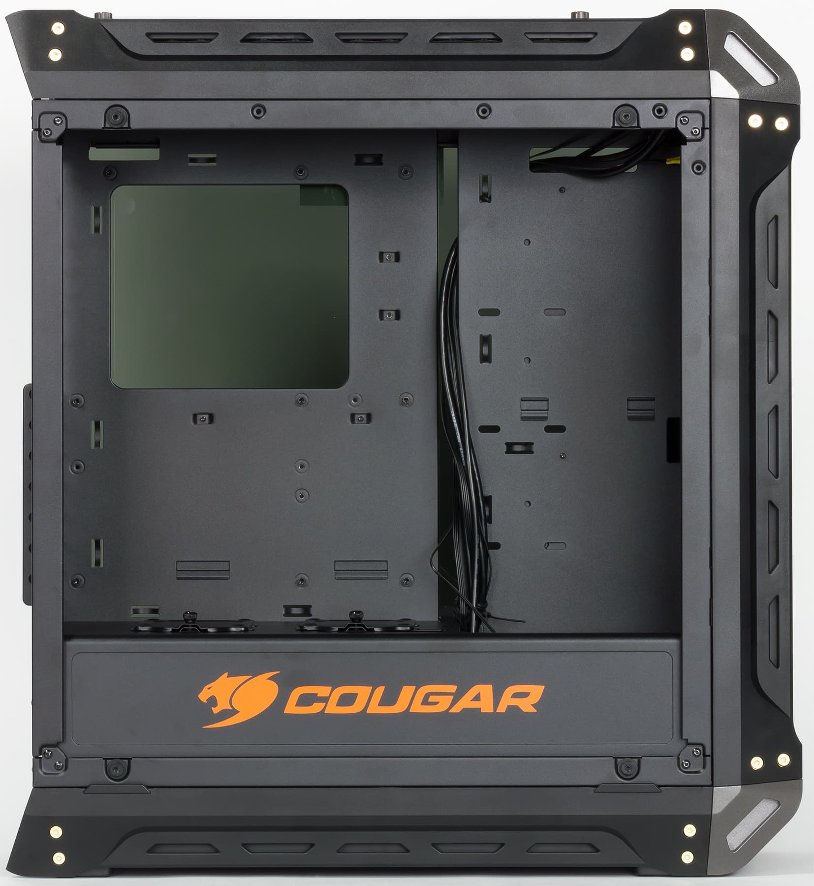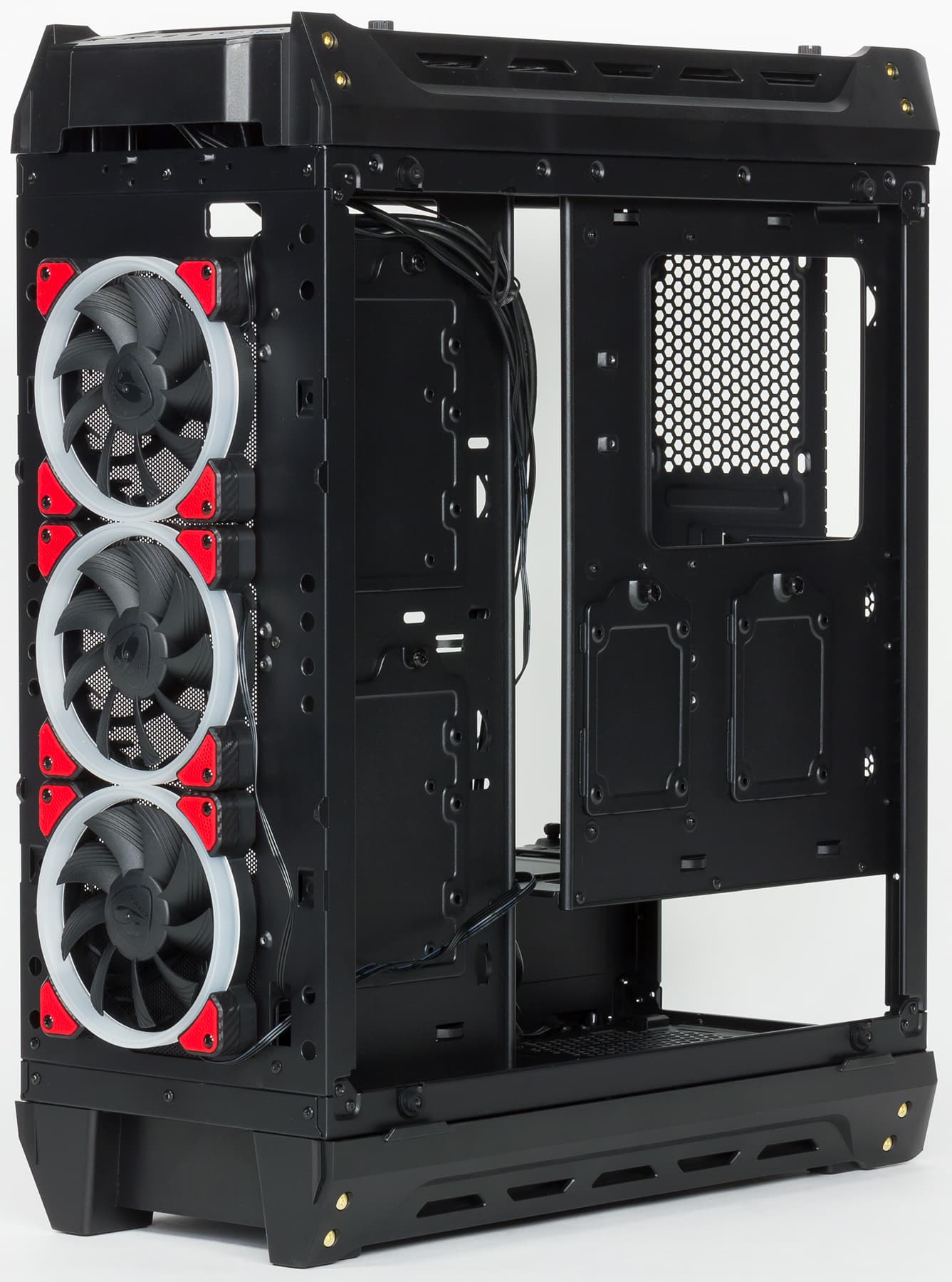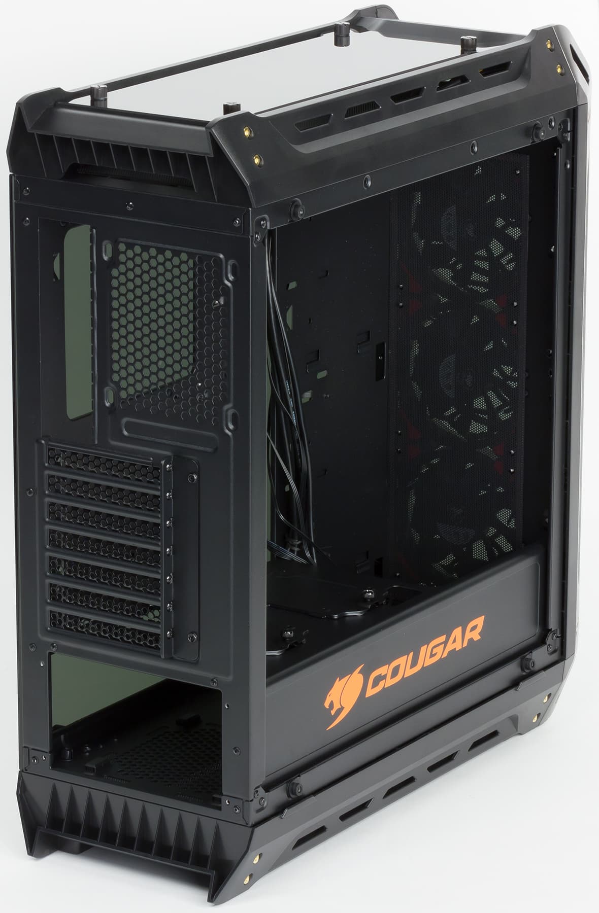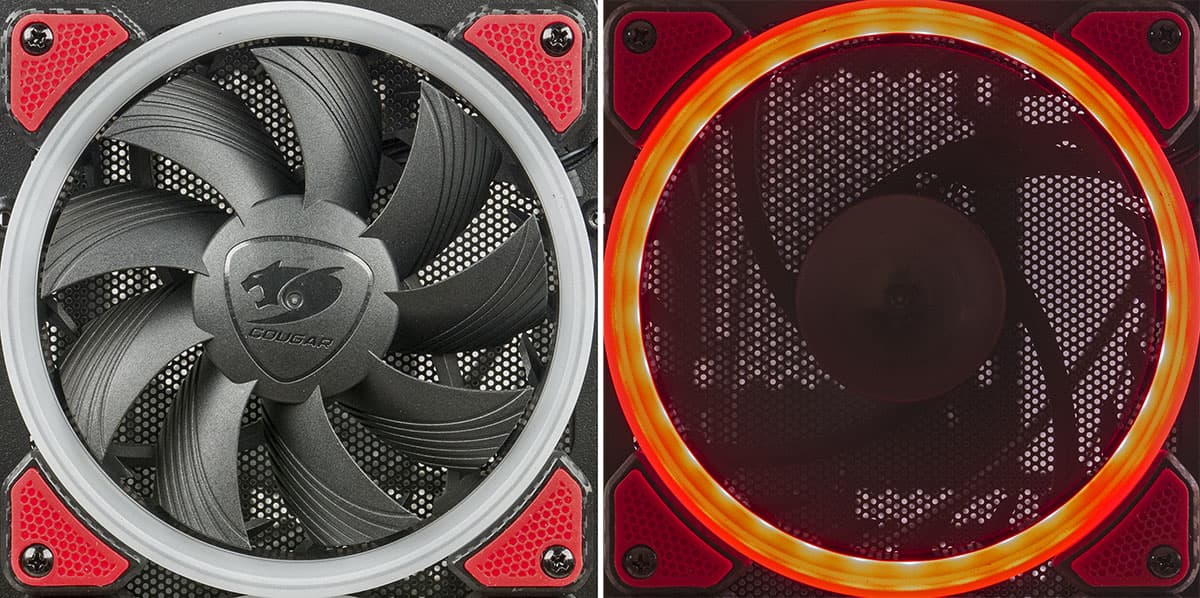 Корпус оснащен тремя 12-сантиметровыми вентиляторами Cougar Vortex LED с подсветкой красного цвета. Все они установлены как нагнетающие спереди, при этом обычного для подавляющего большинства корпусов вытяжного вентилятора на задней стенке нет, имеется только посадочное место размерностью 12 см.