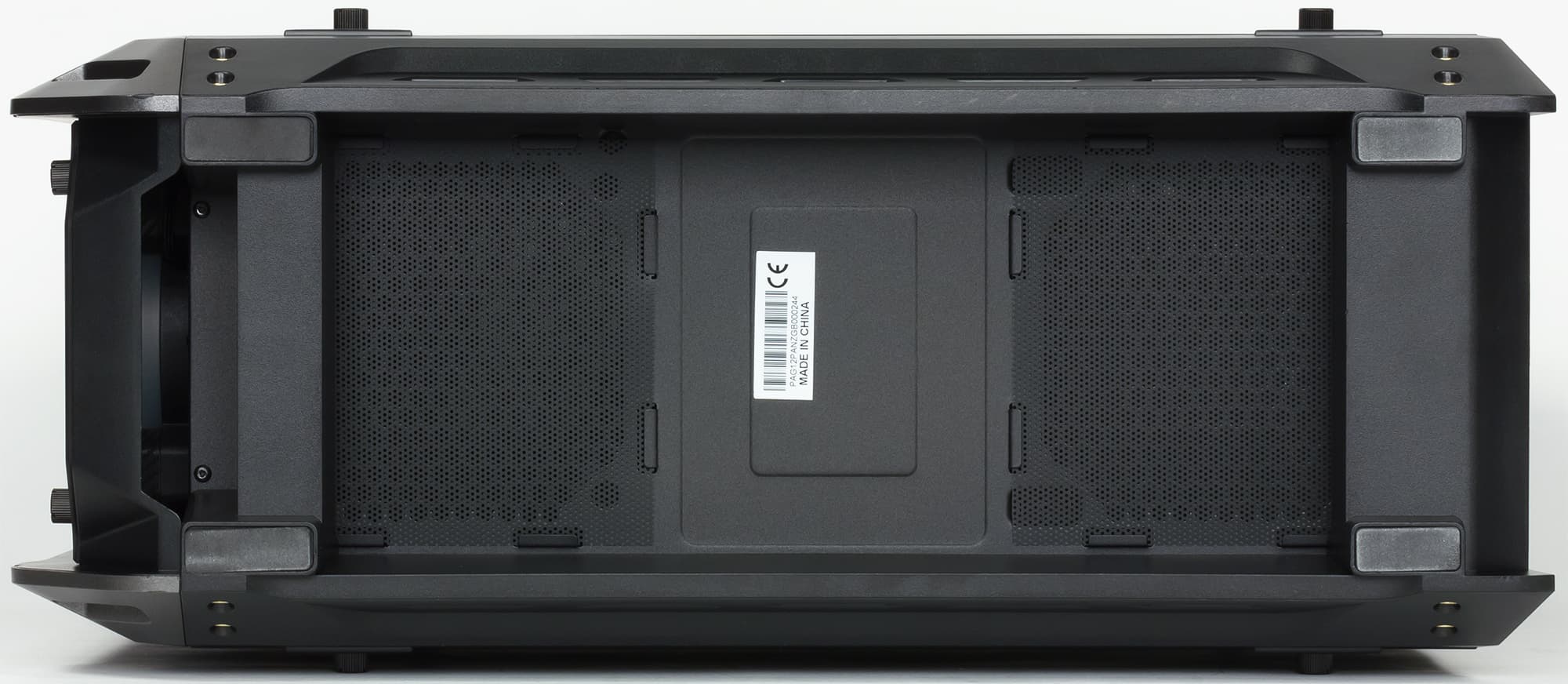 У нижней панели прорези-трапеции тоже есть, но это не воздуховоды, а их имитация для сохранения общего дизайна. Доступ воздуха осуществляется через щели между плоскостью установки и немного приподнятыми за счет ножек нижними кромками панели по всему периметру, но вклад вентилятора в общее охлаждение здесь будет не столь большим.