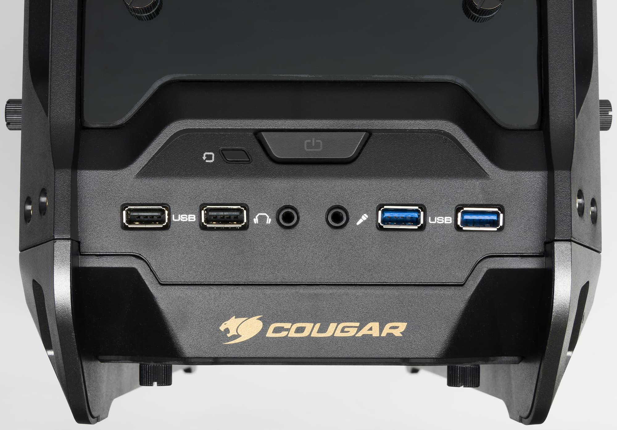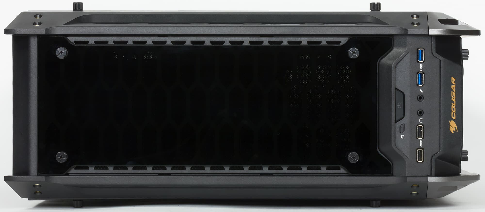 Поясним, как это выглядит в реальности. Мы уже успели привыкнуть к цельностеклянным боковым стенкам в корпусах — минимум одной, а порой и двум. Но в Cougar Panzer-G идея «остекления» доведена до практического максимума: тонированные стеклянные панели здесь не только по обоим бокам, но также вверху и спереди. Если это действительно станет стандартом, то остается только надеяться, что хоть задняя стенка и днище корпусов будут оставаться незастекленными еще какое-то время. Безусловно, сложно говорить о практичности такого решения: на темном стекле очень хорошо заметны отпечатки рук, но даже если к стеклянным деталям не прикасаться, то есть еще и пыль, которая особенно быстро будет накапливаться на верхней поверхности. Но этот корпус не про практичность, он про эстетическую составляющую окружения пользователя. Конечно, фронтальная и верхняя панели корпуса, в отличие от боковых стенок, состоят не только из закаленного стекла. Все же в их основе пластиковая крышка с боковыми вентиляционными прорезями, внутренний объем которой образует полость для установки компонентов системы охлаждения, а центральная часть снаружи закрыта стеклянной панелью.