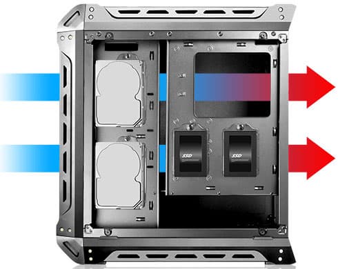Но иллюстрирует она совсем другое — имеющаяся чуть выше надпись поясняет, что установленные накопители не будут влиять на потоки воздуха внутри корпуса, и это действительно так. Однако реальный путь для воздуха будет не столь прямым, как показывают стрелки.