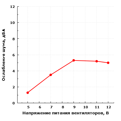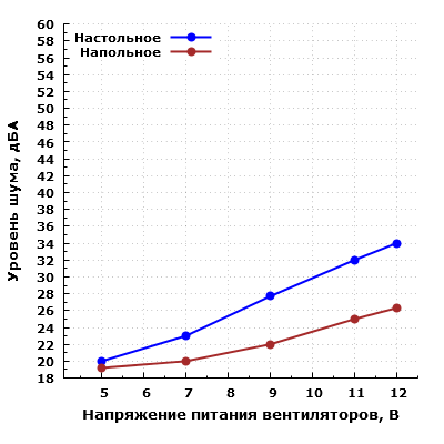 При большем удалении корпуса от пользователя и размещении его, к примеру, на полу под столом, шум можно будет охарактеризовать как минимально заметный при питании вентиляторов от 5 В, а при питании от 12 В — как пониженный для жилого помещения в дневное время суток.