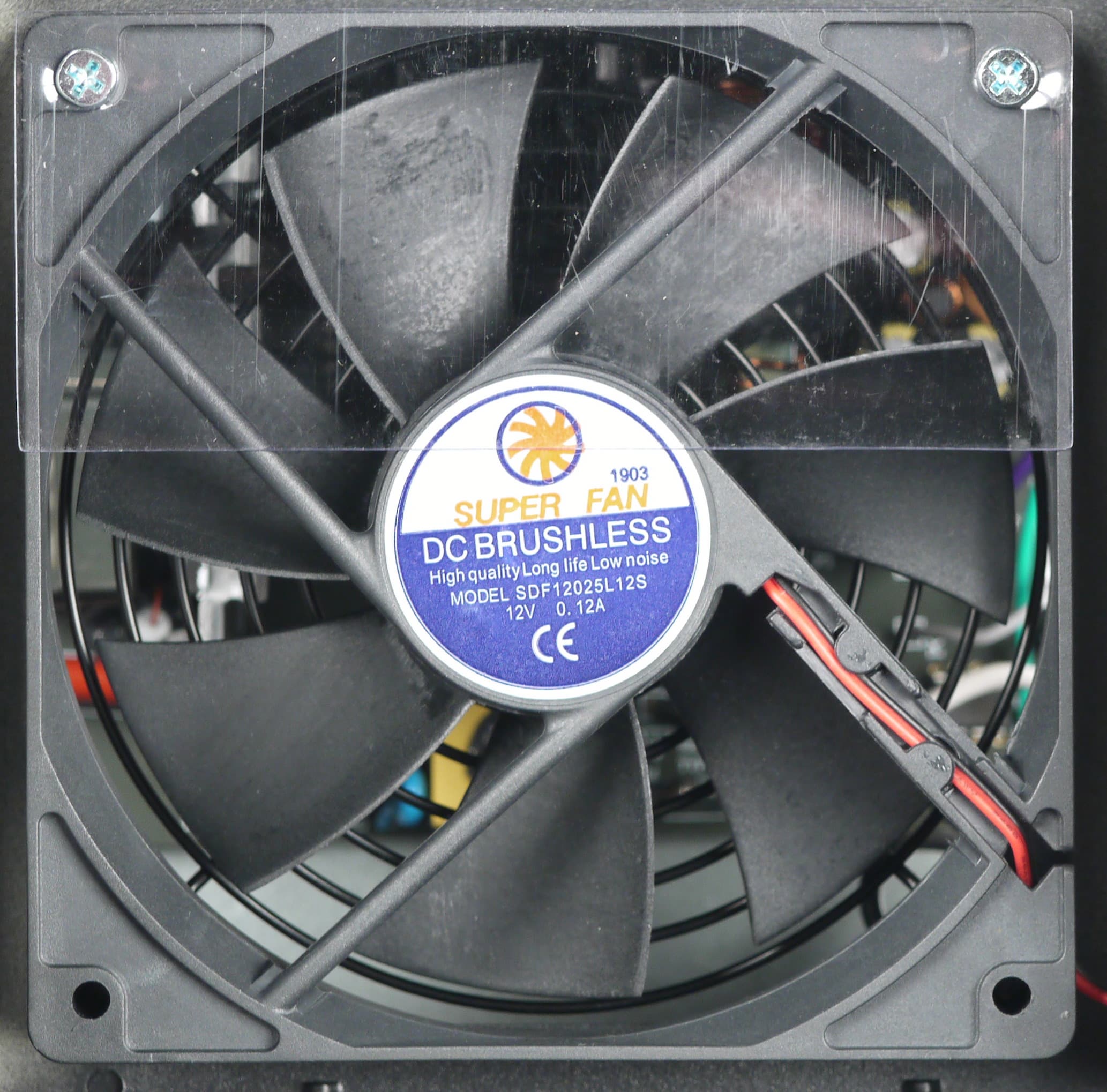 В блоке питания установлен вентилятор Super Fan SDF12025L12S типоразмера 120 мм. Вентилятор основан на подшипнике скольжения. Подключение двухпроводное через разъем.