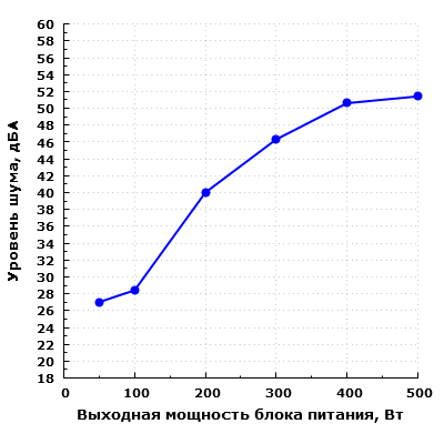 При дальнейшем увеличении выходной мощности уровень шума заметно повышается. При нагрузке в 200 Вт шум блока питания уже достигает значения 40 дБА при условии настольного размещения, то есть при расположении блока питания в ближнем поле по отношению к пользователю. Подобный уровень шума можно охарактеризовать как достаточно высокий. При мощности 400 Вт он уже превышает значение в 50 дБА. Это очень высокий уровень шума, который доставляет сильный дискомфорт в домашних условиях.