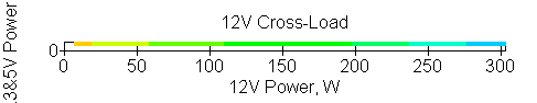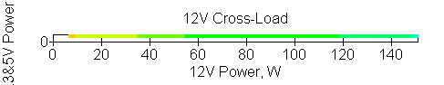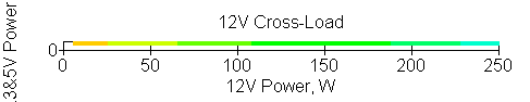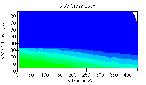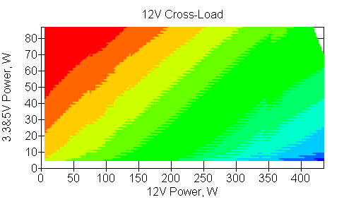 Следующим этапом инструментального тестирования является построение кросснагрузочной характеристики (КНХ) и представление ее на четвертьплоскости, ограниченной максимальной мощностью по шине 3,3&5 В с одной стороны (по оси ординат) и максимальной мощностью по шине 12 В с другой (по оси абсцисс). В каждой точке измеренное значение напряжения обозначается цветовым маркером в зависимости от отклонения от номинального значения.