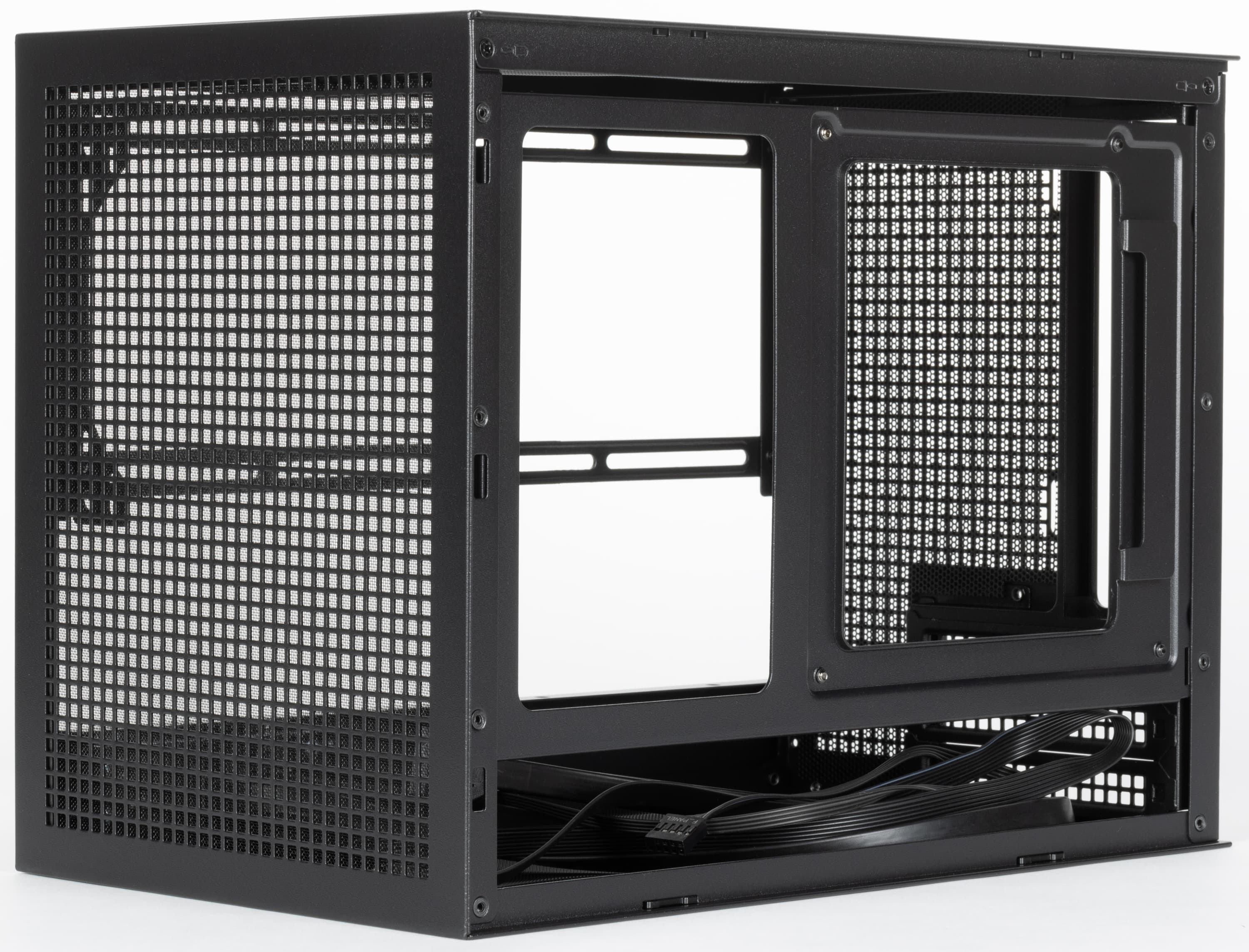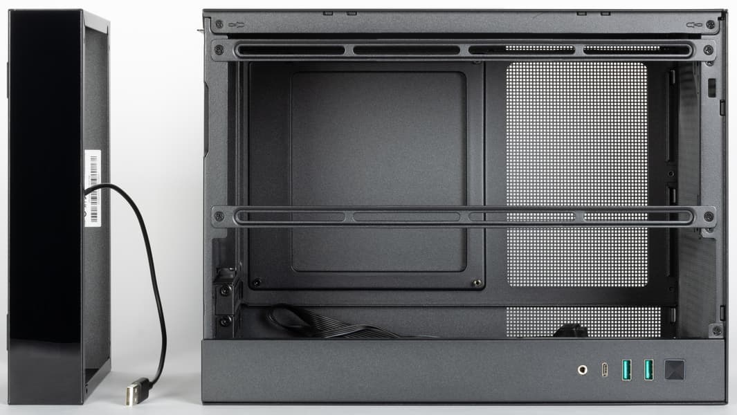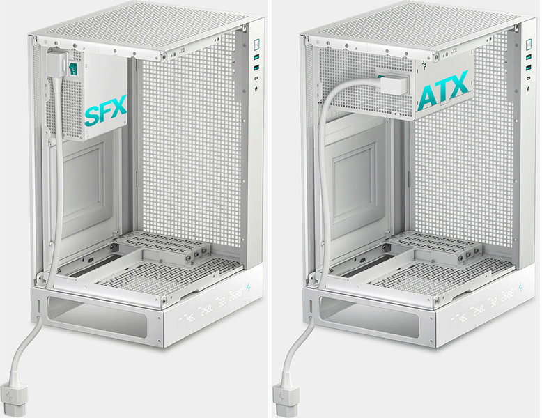 Блок питания подойдет любого из трех форматов: ATX (длиной до 140 мм), SFX и удлиненного SFX-L, устанавливается он в верхней части корпуса. Для крепления БП используется монтажный кронштейн, для которого предусмотрены два положения, а к сети блок питания подключается при помощи имеющегося в комплекте удлинителя, его надо прокладывать внутри корпуса и выводить наружу через U-образный вырез в днище.