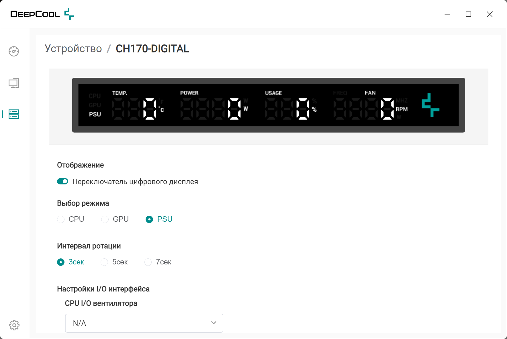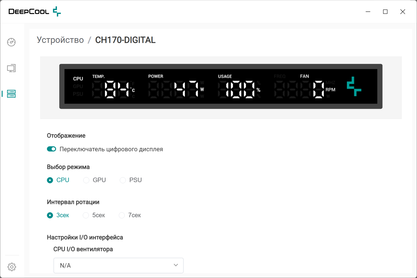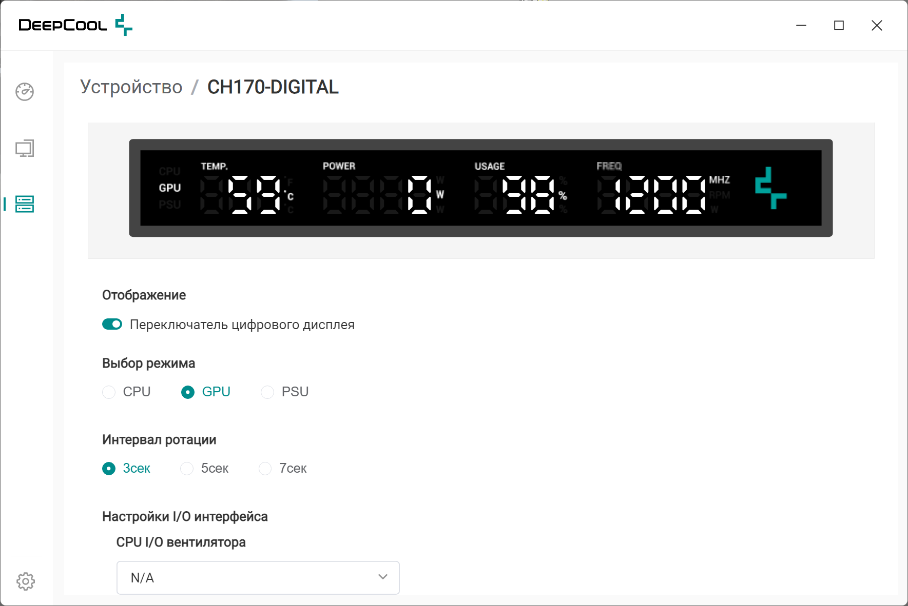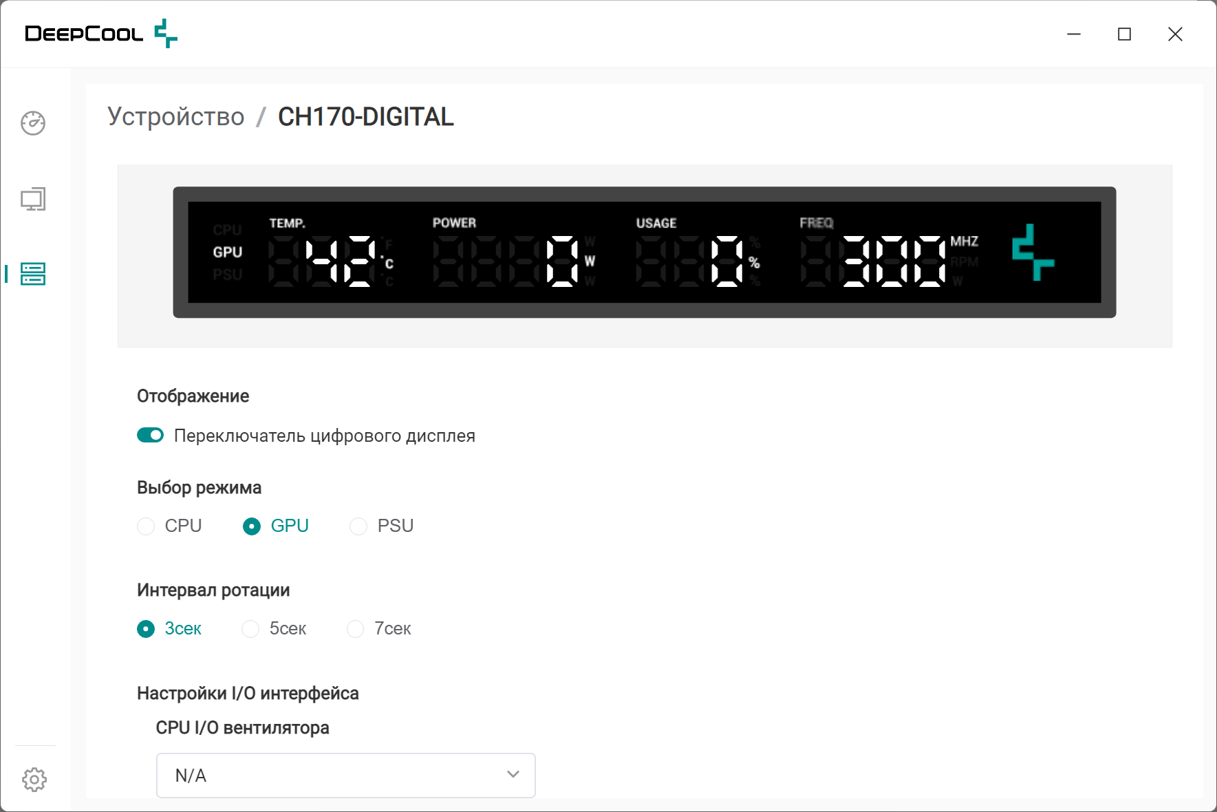 «Интервал ротации» задает периодичность (3, 5 или 7 секунд) смены показаний в правой группе цифр: частота CPU/GPU или скорость вентилятора, но отменить такую ротацию в случае, если данные о вентиляторе отсутствуют, нельзя. Включение автоматического поочередного показа информации для CPU/GPU/PSU также не предусмотрено — переключение осуществляется только вручную.