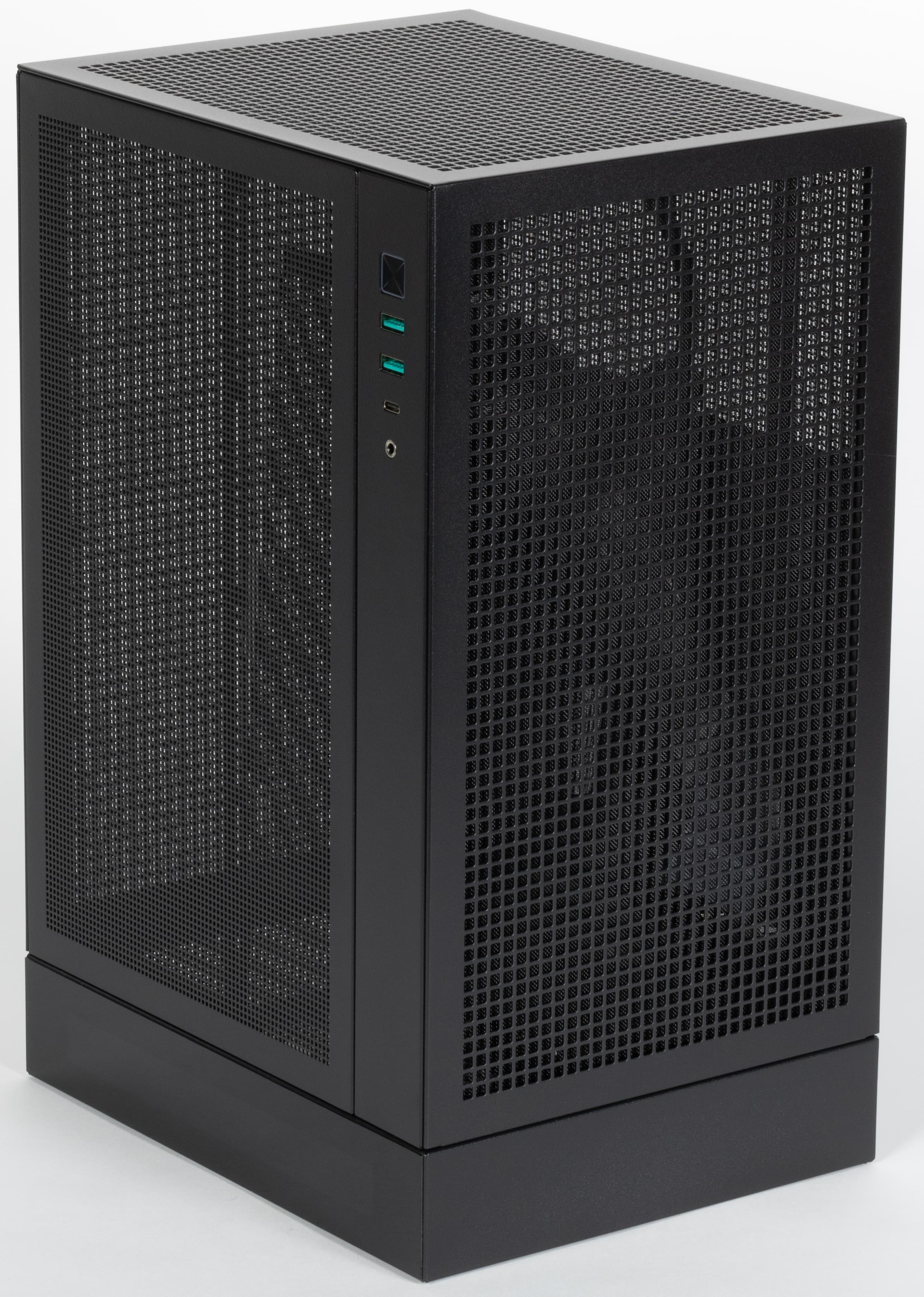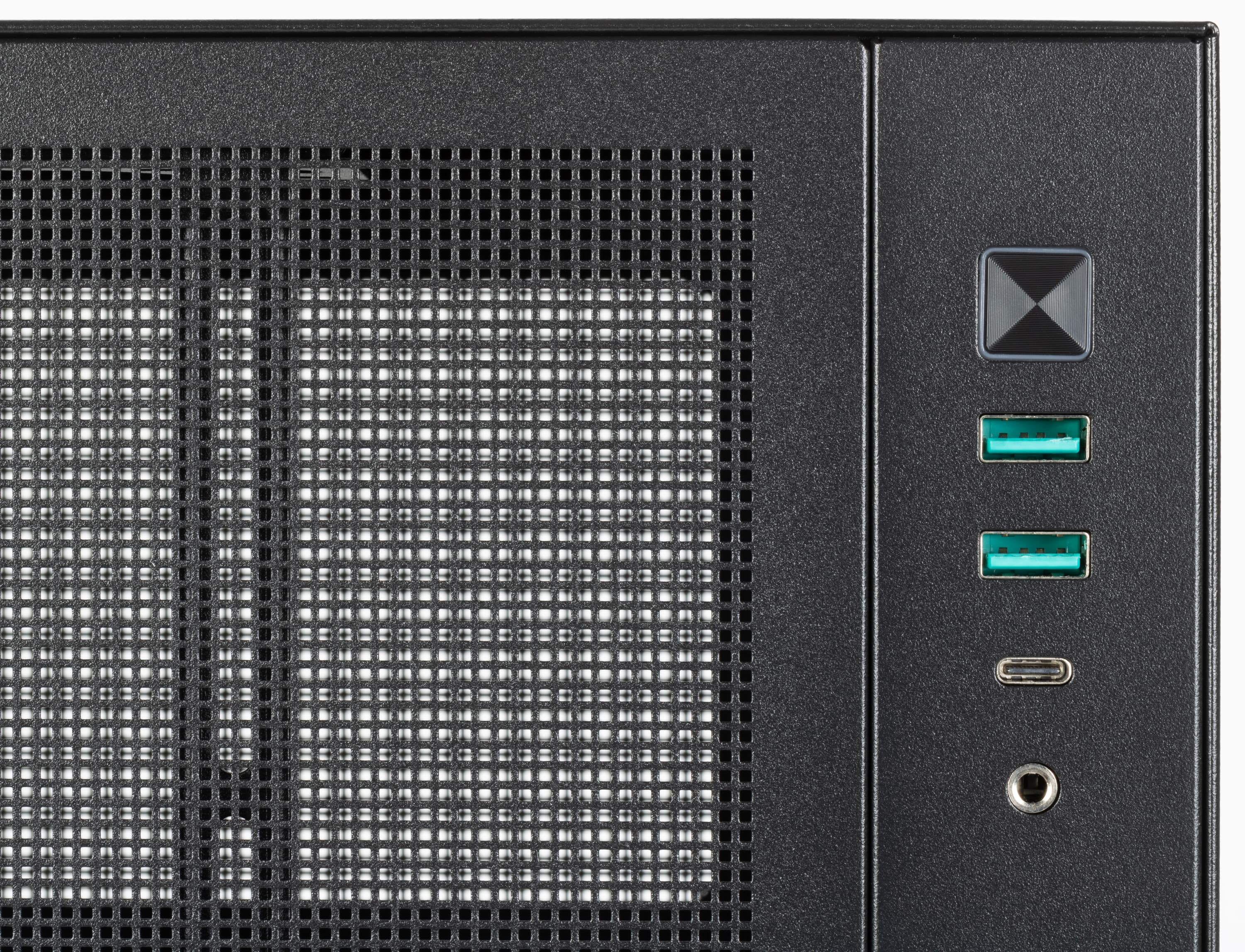 Как сказано чуть выше, интерфейсные разъемы и кнопка расположены вверху в передней части левой плоскости шасси, то есть для доступа к ним слева от компьютера надо предусмотреть свободное пространство. Перечислим сверху вниз: квадратная кнопка питания со встроенной индикацией включения, два порта USB Type-A и один USB Type-C, комбинированный миниджек для гарнитуры. Индикатора дисковой активности и кнопки перезагрузки нет.
