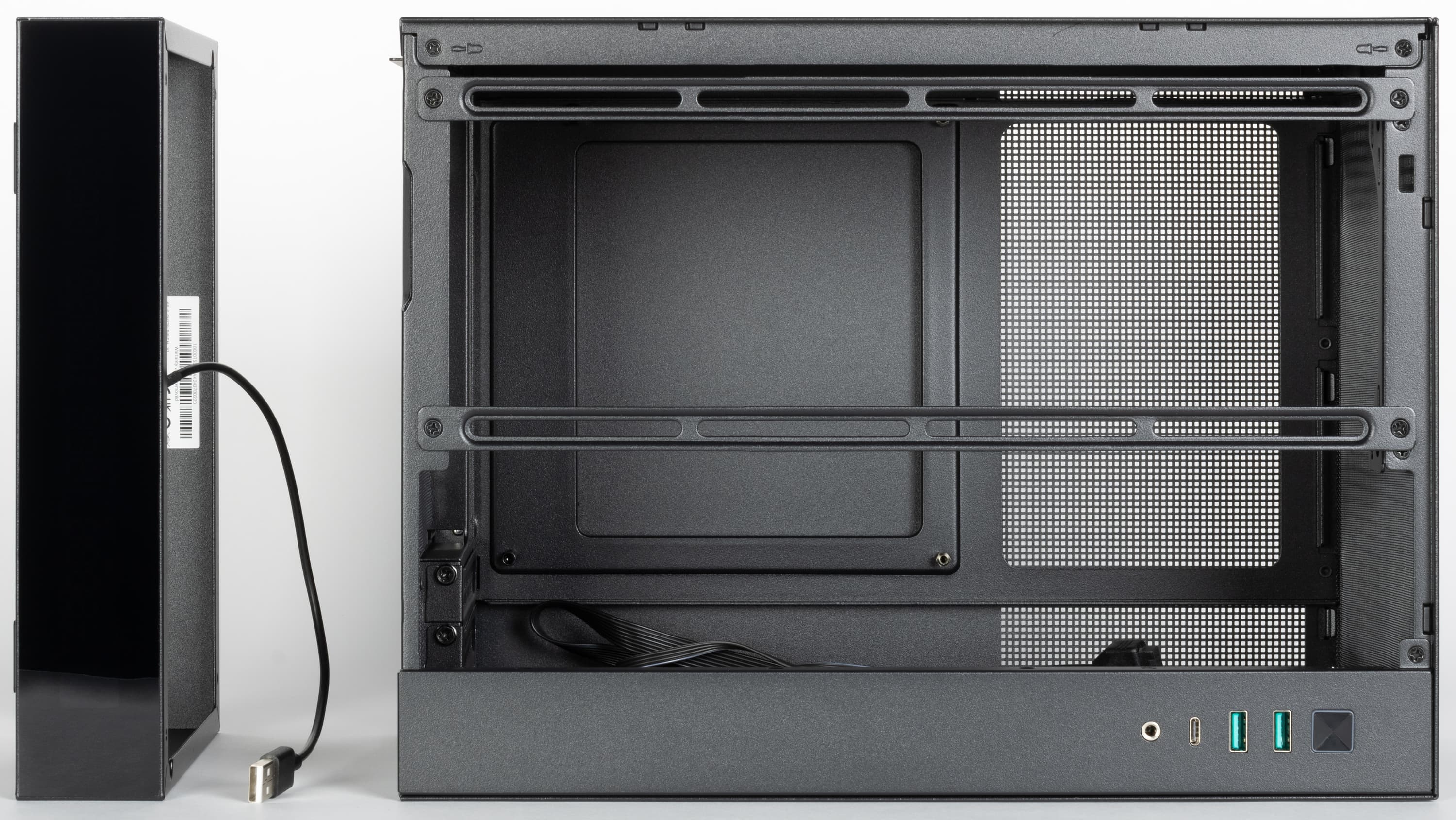Правая стенка закрывает весь соответствующий проем, а после снятия левой стенки в передней части левой боковой плоскости остается еще один элемент: металлическая панель шириной 40 мм с органами управления и коммутации, крепление — двумя винтами к нижней стенке и одним к боковой грани левой части шасси. Ее придется снимать для удобства установки видеокарты; кроме того, без этой панели проще извлекать фронтальный фильтр.