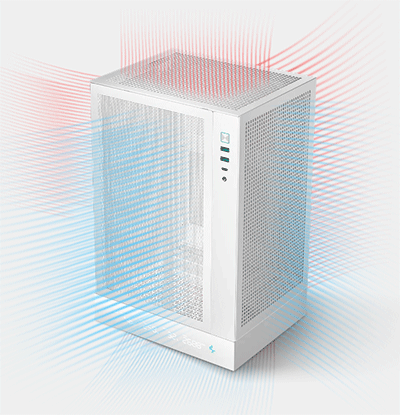 Предустановленных средств охлаждения у модели DeepCool CH170 Digital также нет — заявляется, что обширные перфорированные области со всех сторон обеспечивают «высокий поток воздуха», это надо понимать как хорошую циркуляцию даже без дополнительных мер, но в официальном описании говорится о возможности установки вентиляторов типоразмера 120 мм: двух на левом боку, по одному вверху и внизу, еще двух сзади.