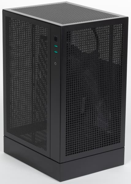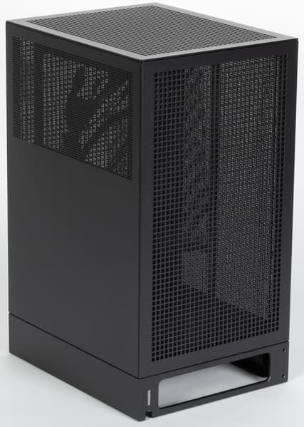 Корпус по форме — ярко выраженная «башня»: стороны его основания заметно меньше высоты, на столе такая конструкция будет занимать минимальное место. Подобное нам уже встречалось среди моделей формата Mini-ITX, не уникальным является и способ установки системной платы: вертикальный, но повернутый на 90° относительно привычного, в данном случае разъемы получаются не сзади, а внизу (в некоторых корпусах они бывают и вверху).