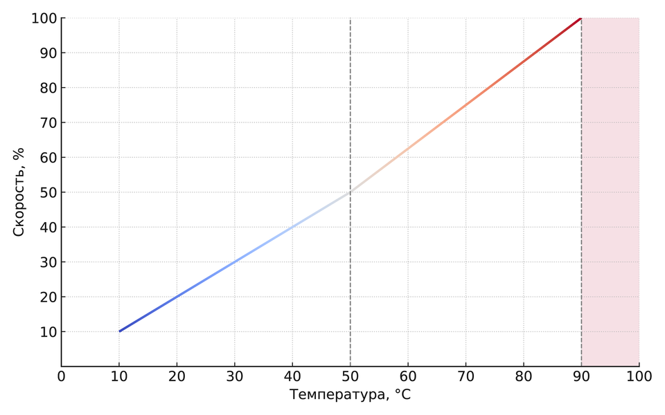 Во всех тестах используется одна кривая управления скоростью вращения: от 10 до 50 °C обороты растут линейно (10 °C — 10%, 20 °C — 20% … 50 °C — 50%). Далее также линейно до 90 °C, где вентиляторы выходят на 100% оборотов, чтобы к моменту достижения критической температуры они уже работали на максимуме.