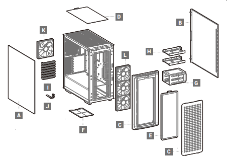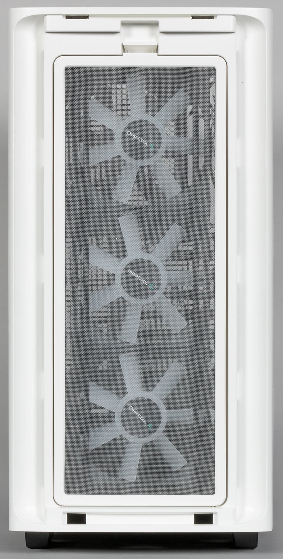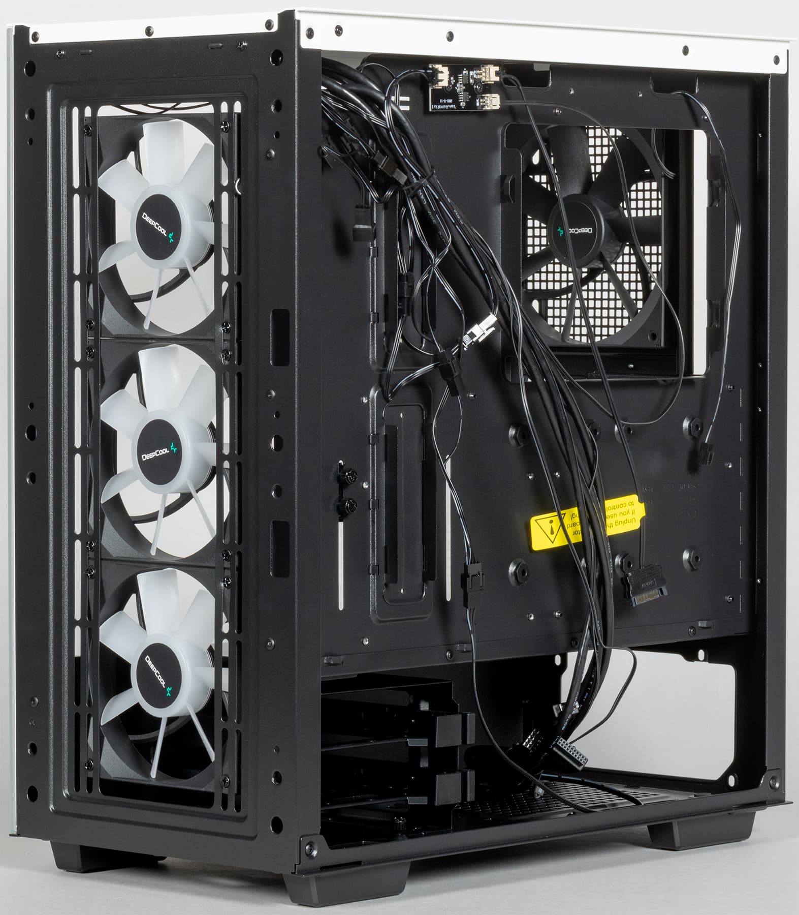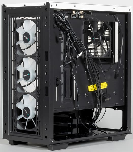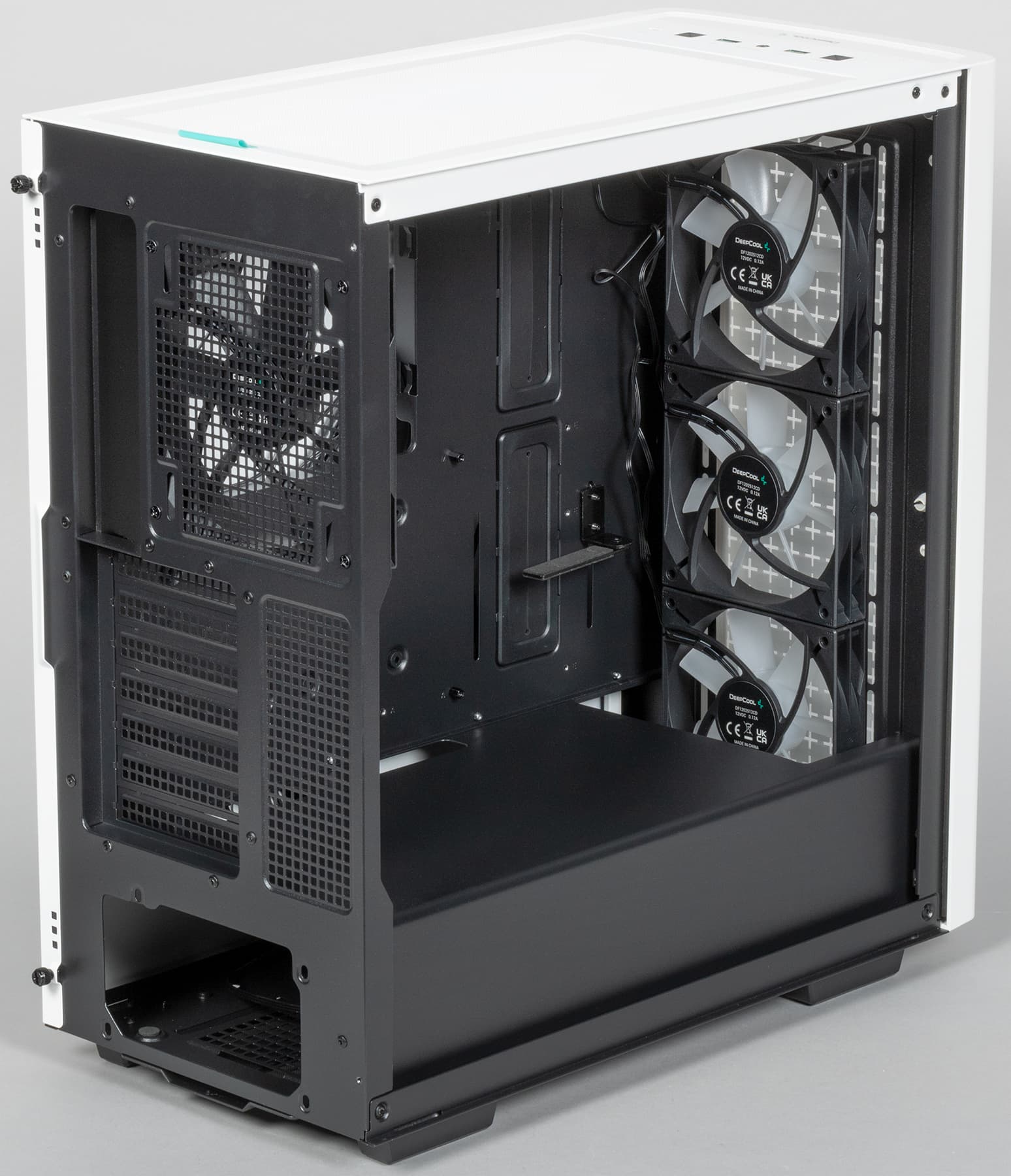 В корпусе предусмотрена возможность установки вентиляторов типоразмера 120 и 140 мм, посадочные места для них имеются спереди, сверху и сзади. Предустановлены же здесь четыре вентилятора типоразмера 120 мм: три спереди (950 об/мин) и один сзади (1200 об/мин).