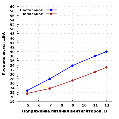 При питании вентиляторов напряжением 5 В шум находится на очень низком уровне даже при расположении микрофона в ближнем поле, однако с ростом напряжения питания уровень шума возрастает. В типовом диапазоне регулирования напряжения 7—11 В шум изменяется от пониженного (28 дБА) до повышенного (38 дБА) уровня относительно типичных значений для жилых помещений в дневное время суток.