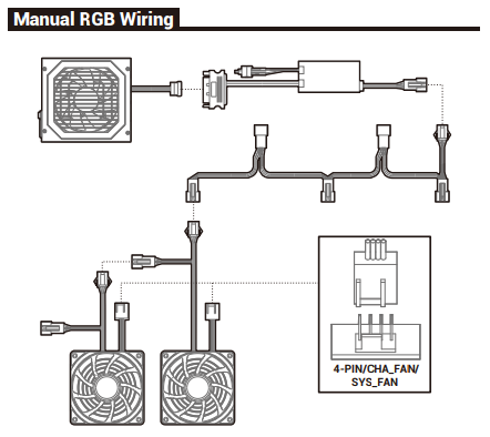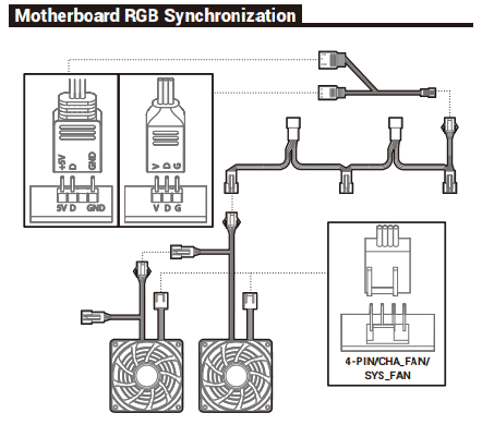 Передние вентиляторы имеют по два разъема: стандартный трехконтактный с возможностью подключения к системной плате с управлением питающим напряжением и проприетарный трехконтактный c колодкой 1×3 для управления подсветкой. Задний вентилятор лишен подсветки, поэтому у него только один трехконтактный разъем для управления скоростью вращения.