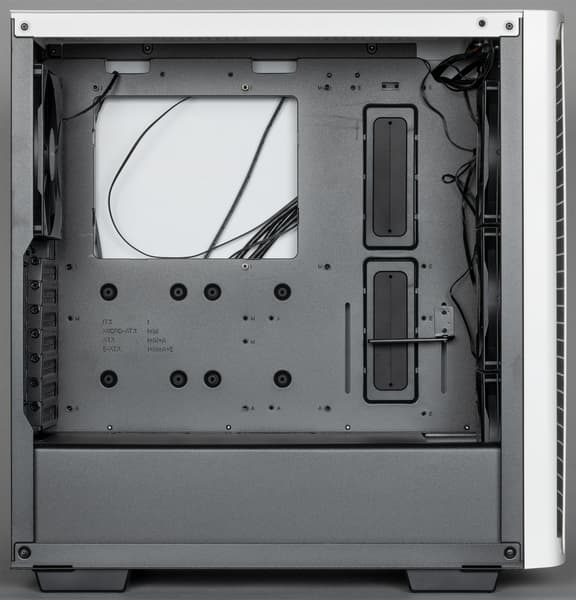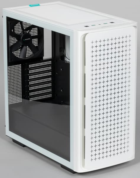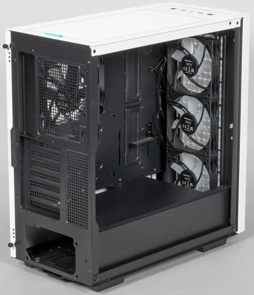 Deepcool CK560 выпускается в двух цветовых вариантах, черном и белом, и к нам на тестирование попал корпус в белом оформлении. Стоит отметить, что белый он только снаружи, тогда как шасси полностью черное, включая заднюю панель. Это скорее достоинство, чем недостаток, так как с обликом полностью белых корпусов обычно сильно дисгармонируют типичные черные провода внутри, а так черно-белое сочетание подразумевается изначально. Впрочем, как всегда, вопросы вкусовых предпочтений не являются предметом нашего обзора.