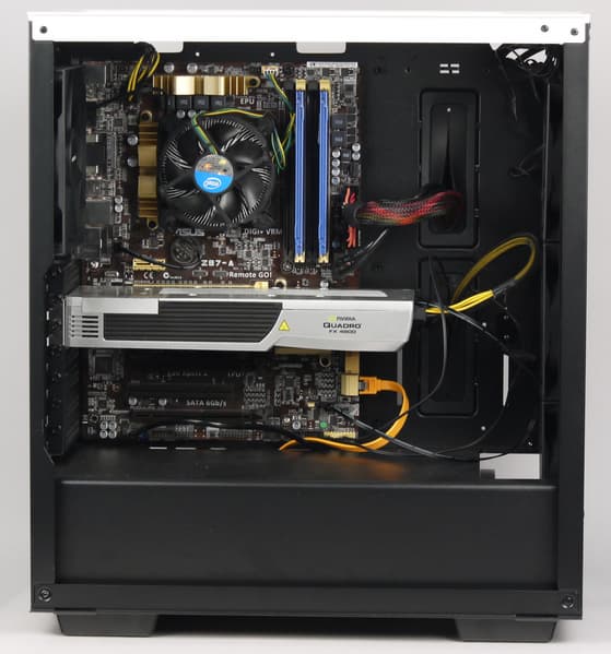 Далее можно установить требуемые платы расширения, например видеокарту, которая может достигать в длину около 380 мм, если объем корпуса между системной платой и передней стенкой шасси ничем не занят. В штатном варианте с установленными вентиляторами расстояние уменьшается до 370 мм, а если исходить из удобства манипулирования, то максимальный размер видеокарты составит около 340 мм от задней панели. Впрочем, и этого вполне достаточно для почти любой современной видеокарты.