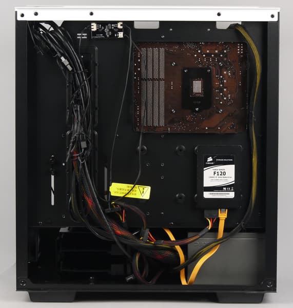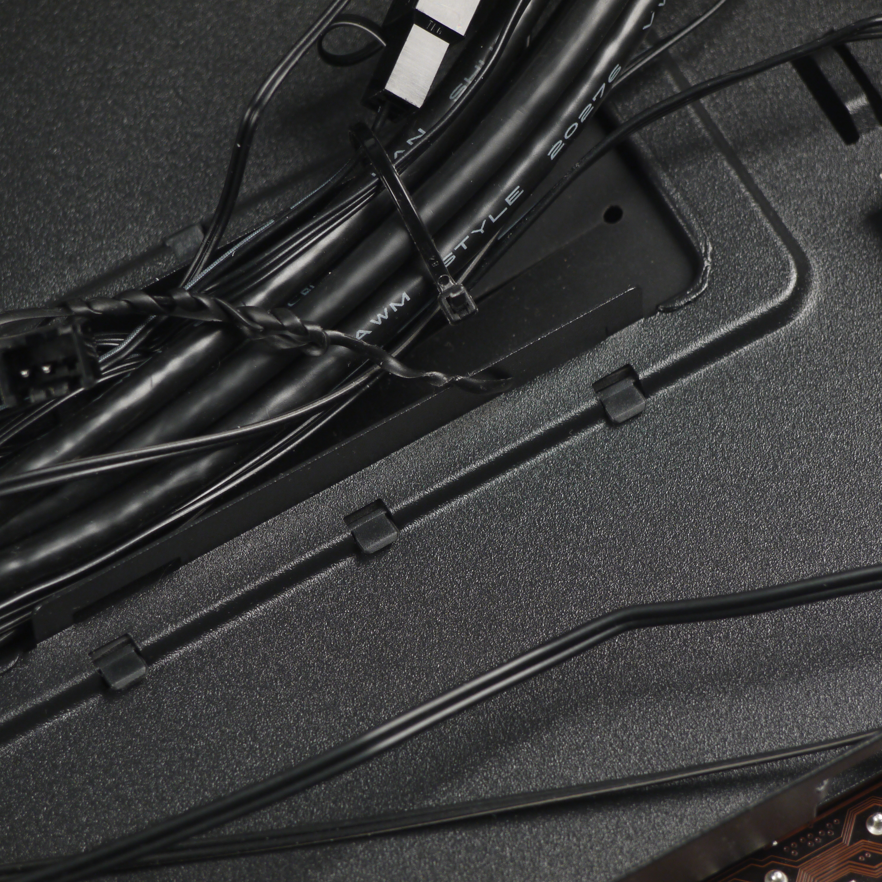 Глубина отсека для прокладки проводов составляет около 20 мм у задней стенки. Это не так уж много, поэтому блок питания лучше предпочесть с ленточными проводами. Для монтажа проводов предусмотрены петли для крепления стяжек или других аналогичных изделий, а также некое подобие кабельного лотка, который сформирован загнутыми элементами основания для системной платы в местах технологических отверстий. В монтажных отверстиях на основании для системной платы имеются лепестковые мембраны из резиноподобного материала, также монтажные отверстия для прокладки проводов есть и в кожухе блока питания, но мембран там уже нет.