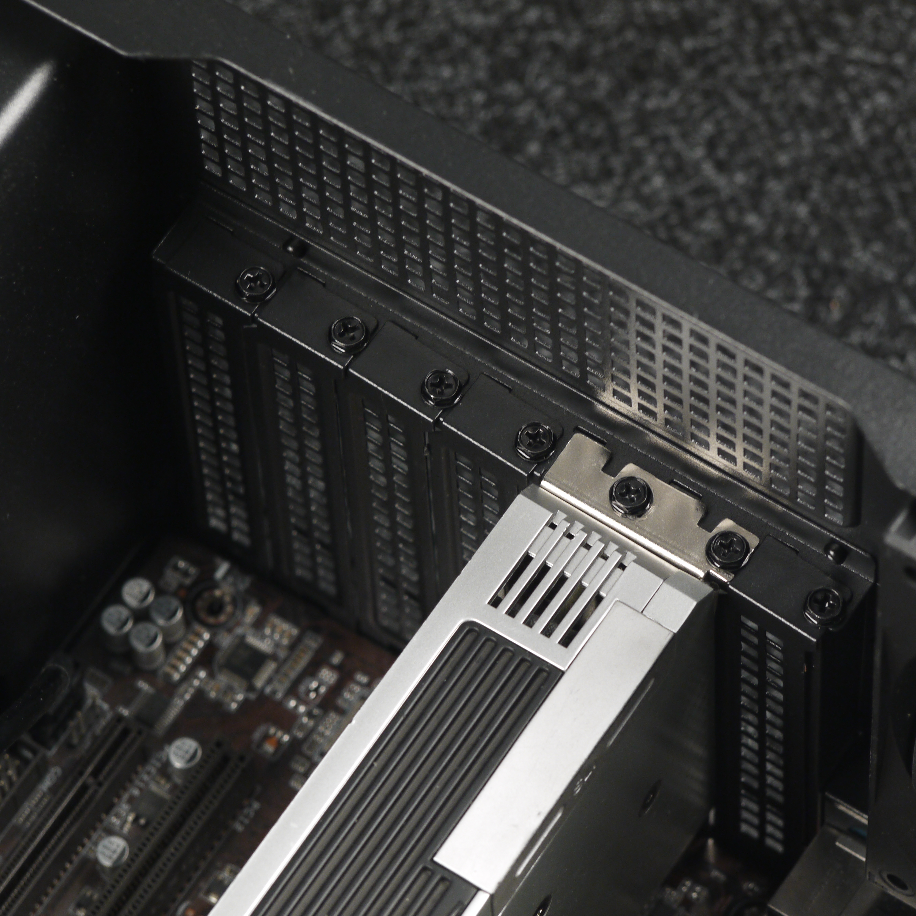 Система фиксации карт расширения самая обычная — крепление на винтах изнутри корпуса с индивидуальной фиксацией. Все заглушки для плат расширения съемные, фиксируются одним винтом с накатной головкой.