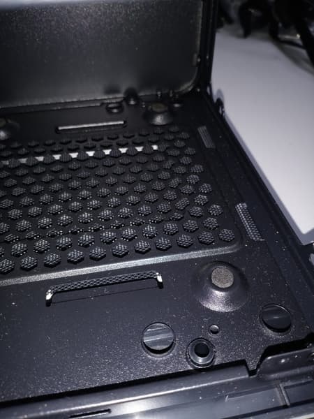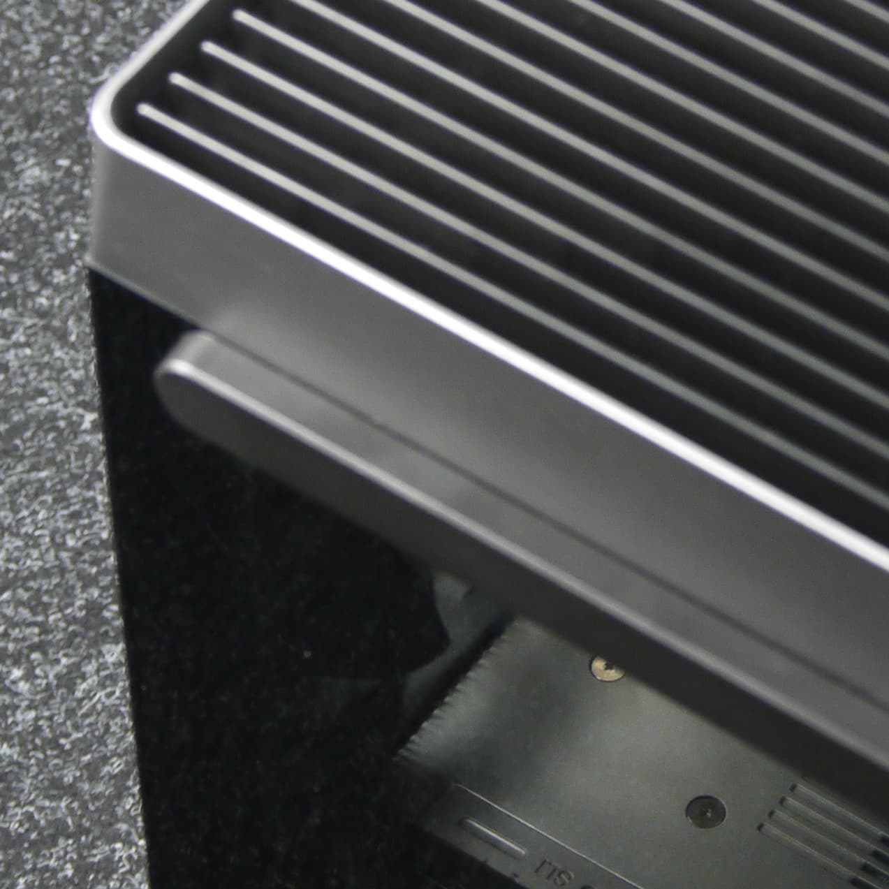 Левая стенка снизу вставляется в узкий паз, где установлен уплотнитель из вспененного материала. Попадать в паз нужно достаточно точно, что не всегда получается с первого раза, но зато стенку можно устанавливать и на стоящий вертикально корпус. Сверху обе боковые стенки фиксируются при помощи магнитов, расположенных вдоль верхней стенки шасси. Сами магниты вмонтированы в пластиковые держатели, прикрученные к шасси винтами.