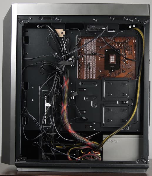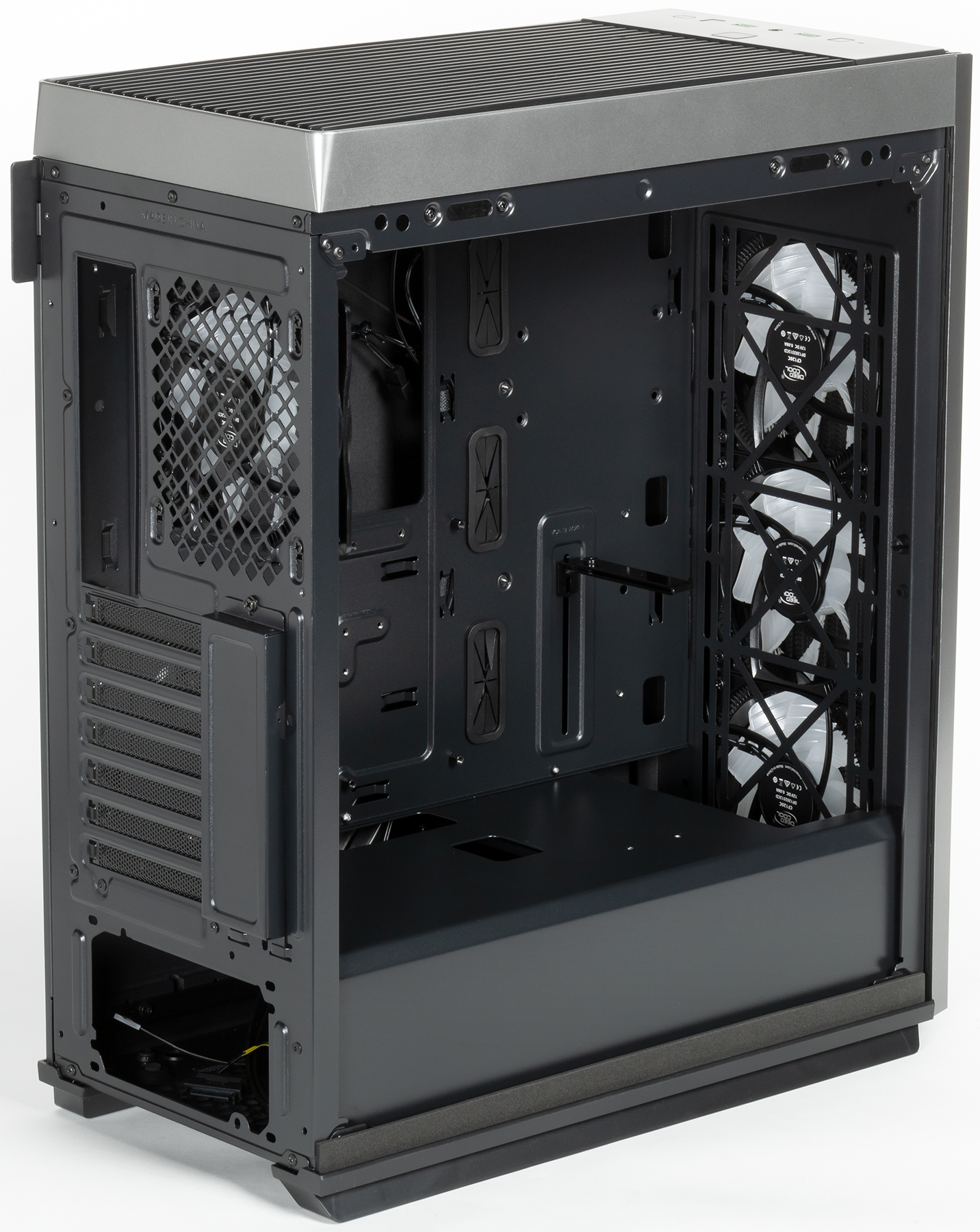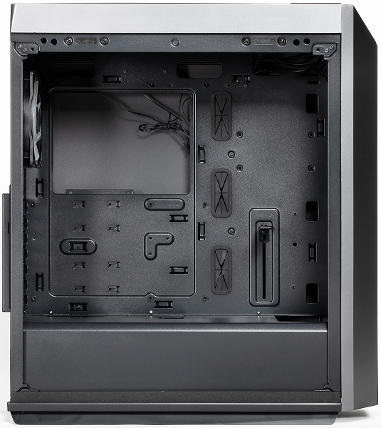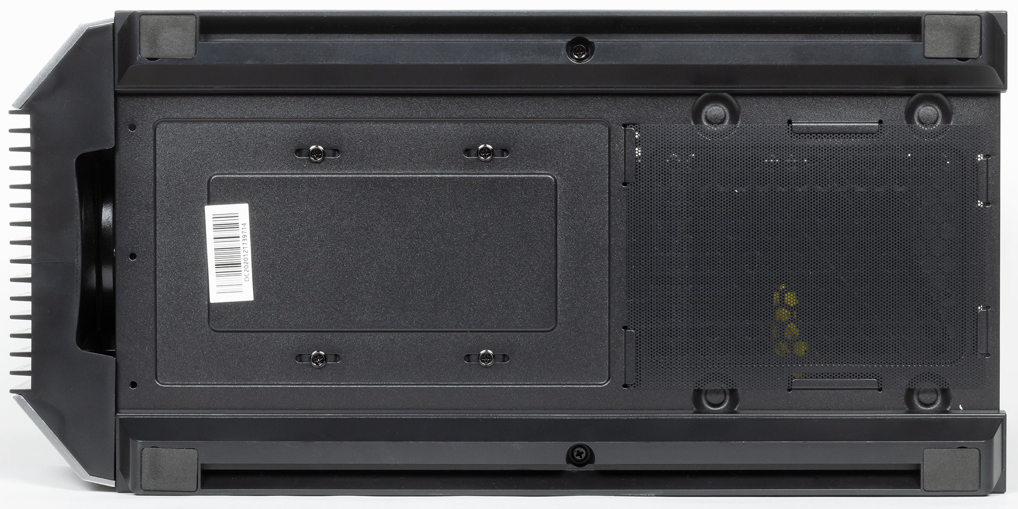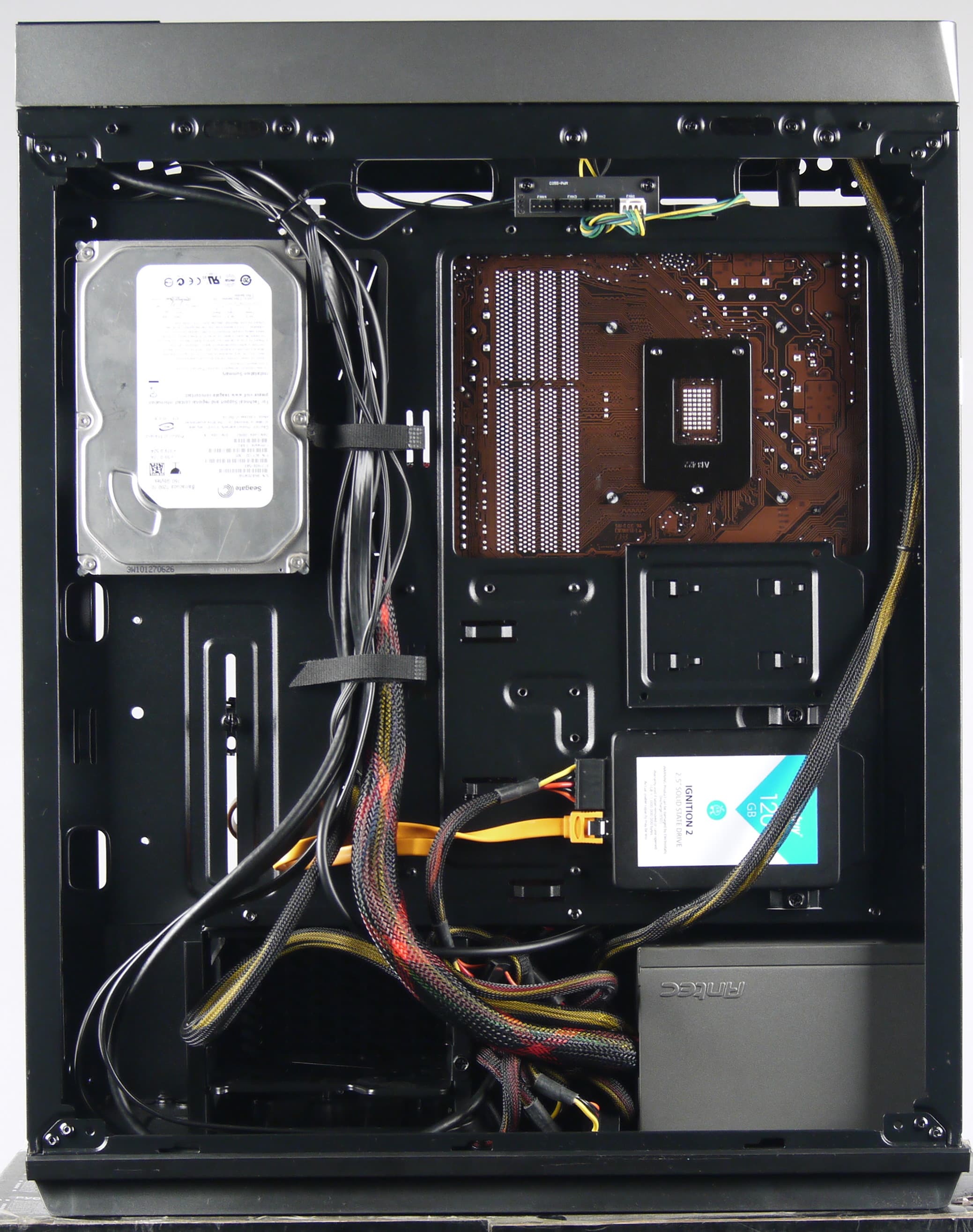 Компоновочные решения данной модели определяются современными тенденциями корпусостроения. В данном случае разработчики отказались от отсека для устройств формата 5,25″, а привычный отсек для устройств 3,5″ расположен около передней стенки шасси, но присутствует он в усеченном виде — всего на два диска. При желании его можно снять, открутив винты. На оборотной стороне основания для системной платы также присутствуют места для установки накопителей. А вот посадочные места для накопителей с внешним доступом в корпусе полностью отсутствуют.