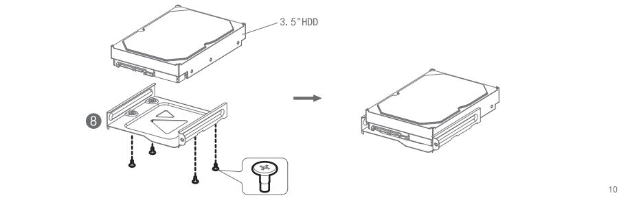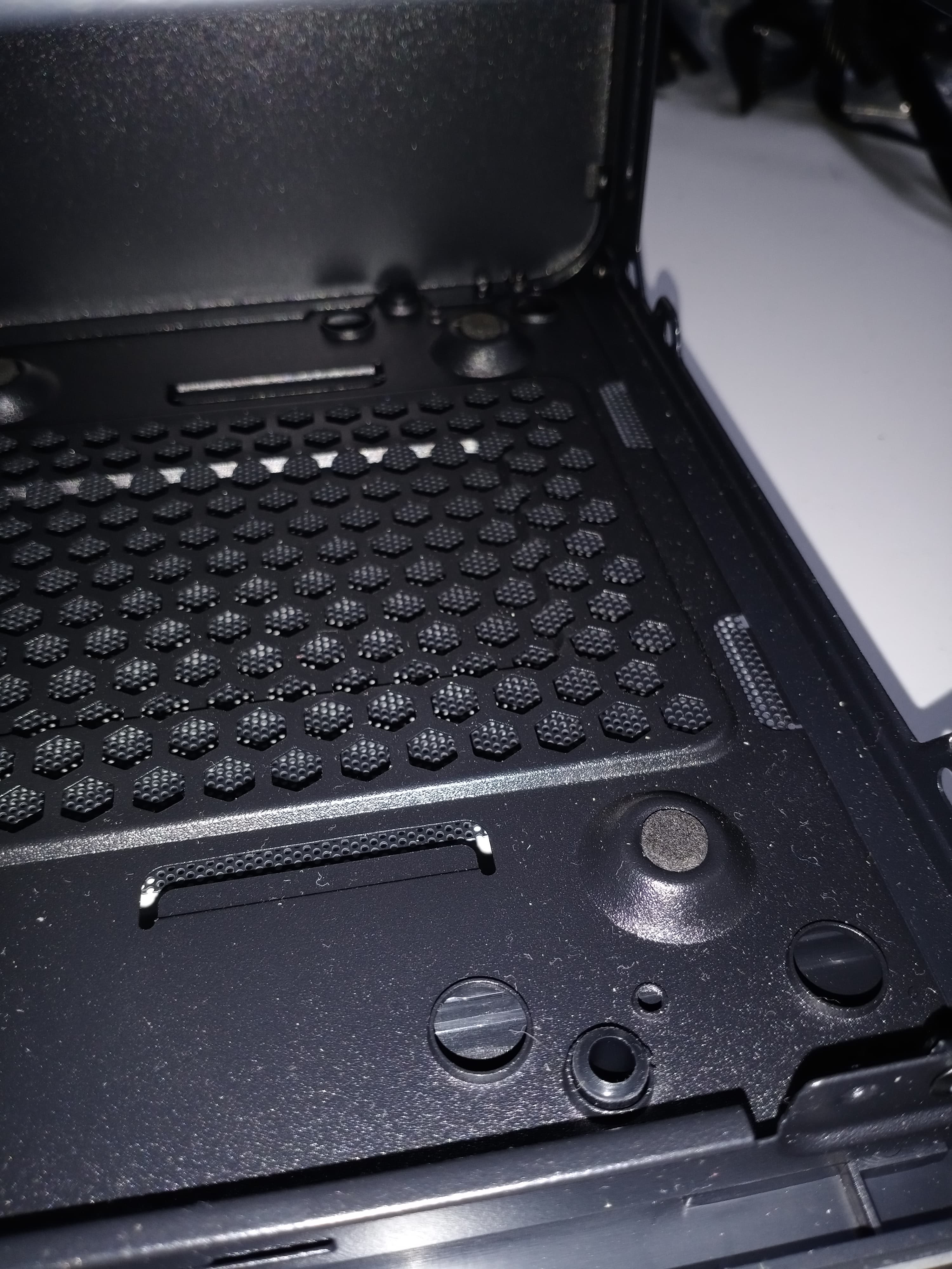 Для одного накопителя формата 3,5″ предусмотрено посадочное место на обратной стороне основания для системной платы около передней стенки шасси. Фиксация накопителя осуществляется при помощи винтов, которые нужно вкрутить в накопитель со стороны дна сквозь основание для системной платы (с лицевой стороны). Данное место, судя по всему, в характеристиках корпуса никак не учитывается и в инструкции по сборке не фигурирует.