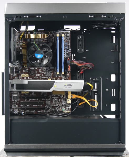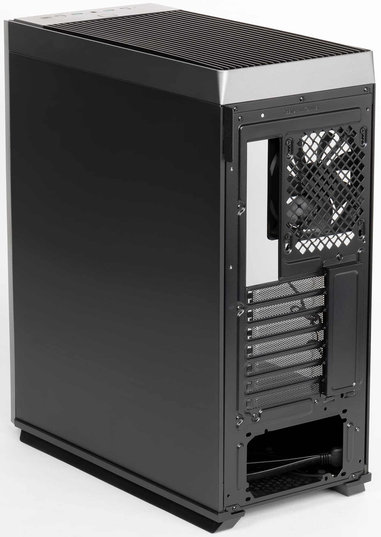 Уровень шума и при напольном, и при настольном размещении корпуса очень низкий во всем диапазоне регулирования напряжения вентиляторов (от 5 до 12 вольт). Но достигается это благодаря использованию одного низкоскоростного вентилятора, установленного сзади. Для большинства недорогих конфигураций этого будет вполне достаточно, особенно с учетом наличия верхнего выхлопа. При сборке системы с высоким тепловыделением корпус можно оснастить вентилятором сверху, который обеспечит улучшенный теплоотвод, а также заменить задний вентилятор и лучше на модель с ШИМ-управлением.