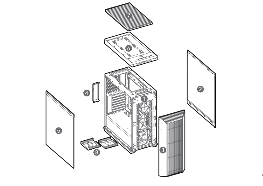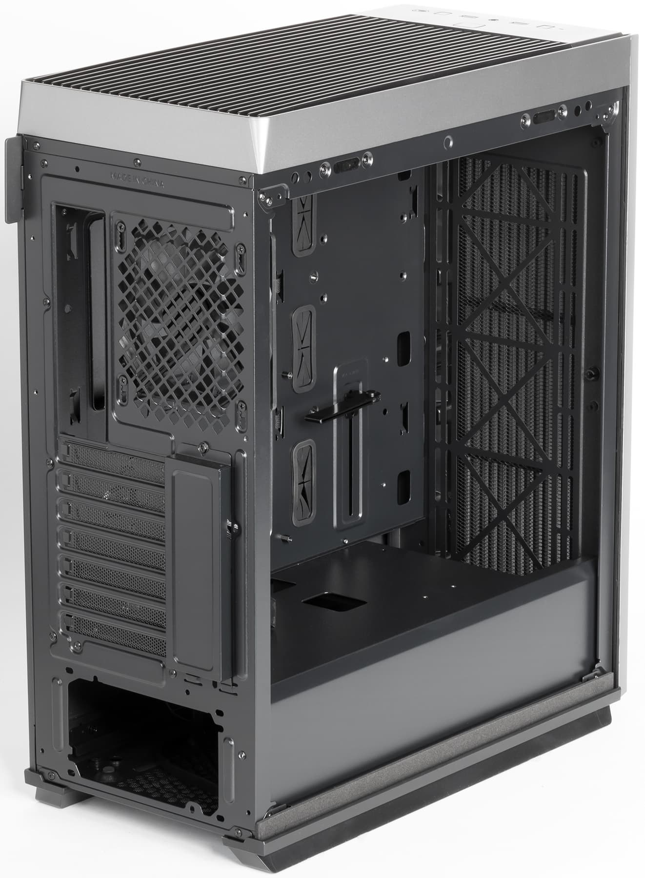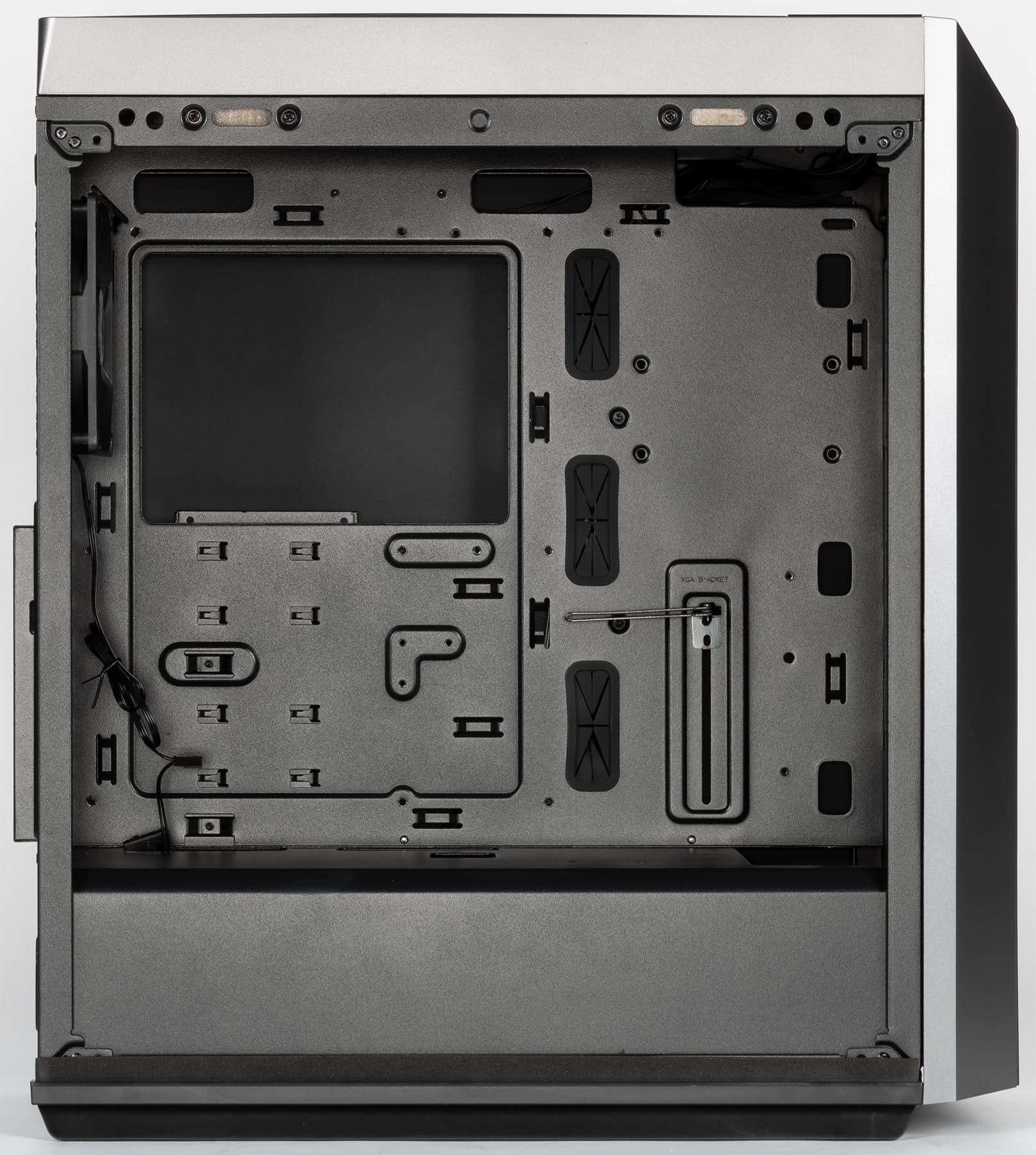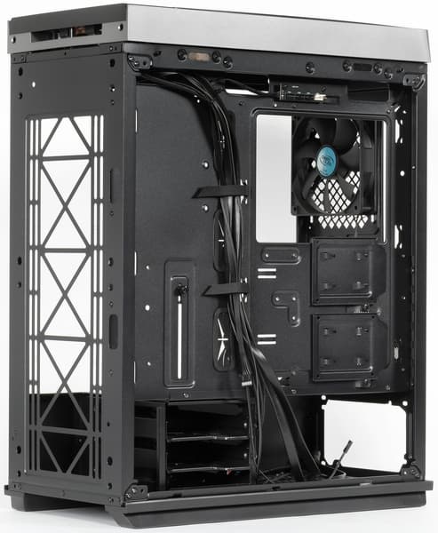 Компоновочные решения данной модели определяются современными тенденциями корпусостроения. В данном случае разработчики отказались от отсека для устройств формата 5,25″, а привычный отсек для устройств 3,5″ расположен около передней стенки шасси, но присутствует он в усеченном виде — всего на два диска. При желании его можно снять, открутив винты.