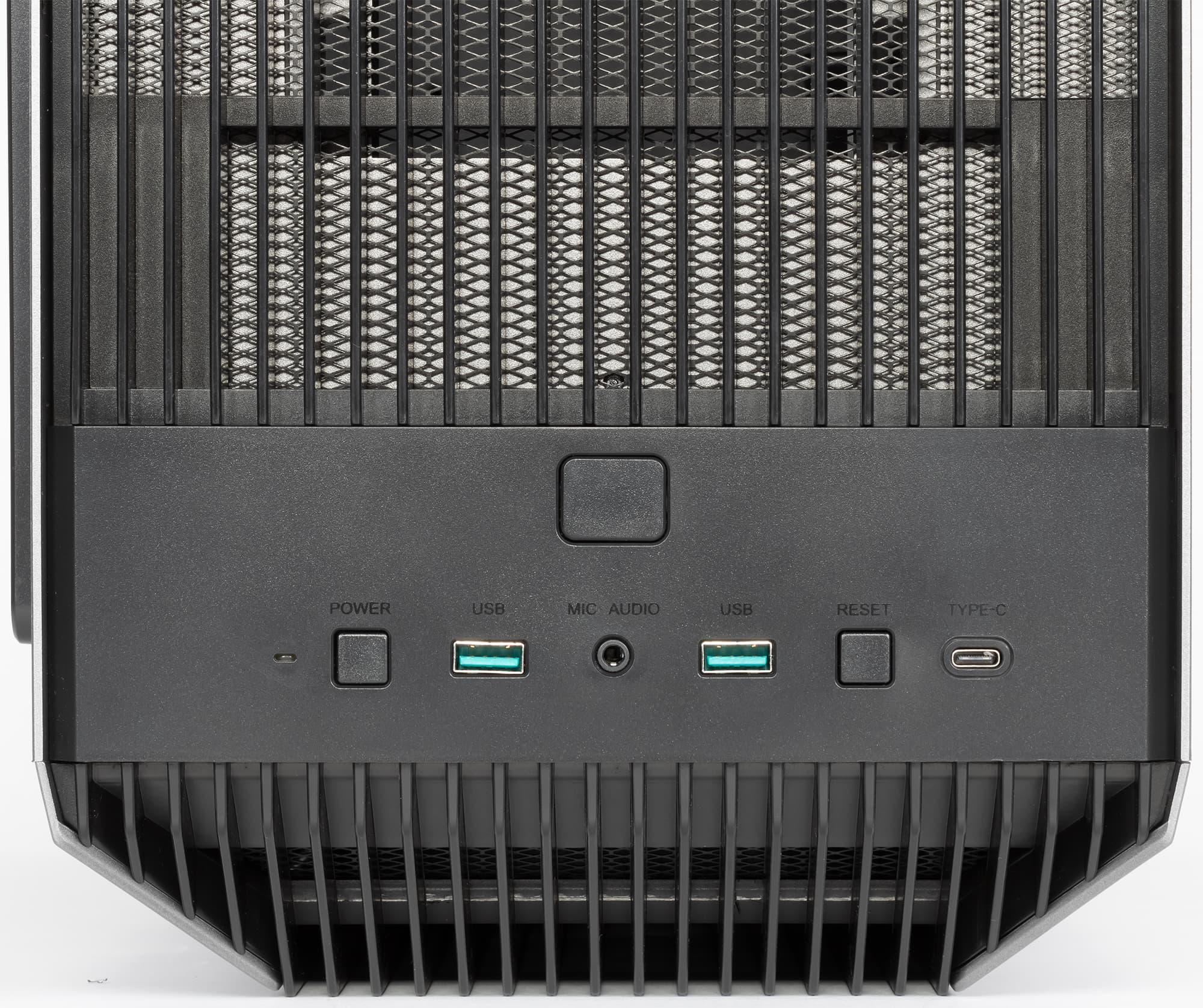 На верхней стенке в передней части корпуса размещены органы управления и коммутации. В их состав входят: два разнесенных друг от друга примерно на 8 мм порта USB 3.0, один порт USB 3.1 Gen 2 (USB 3.1) Type-C, комбинированный разъем для подключения микрофона и наушников или гарнитуры. Таким образом, корпус позволяет подключать проводные гарнитуры как с цифровым, так и с аналоговым интерфейсом со стороны передней панели. Но разъемов USB все-таки хотелось бы видеть чуть больше.