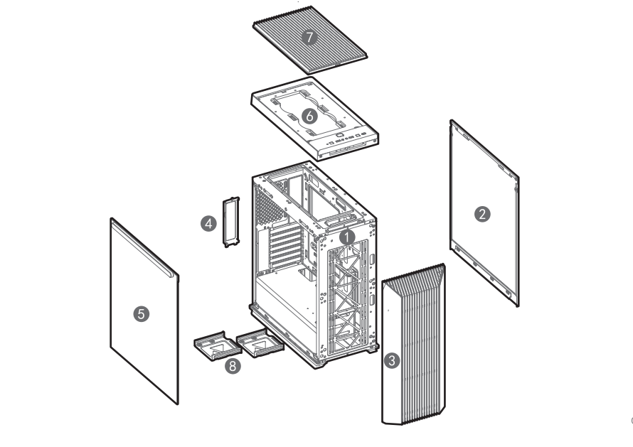 Обе боковые стенки имеют безвинтовое крепление похожей конструкции при помощи магнитов. Боковые стенки вставляются вертикально. Для этого предусмотрены щелевые отверстия в нижней части корпуса, что облегчает процесс сборки. На стеклянной стенке для удобного хвата предусмотрена специальная ручка. Для их излечения стенку нужно предварительно отклонить, преодолев усилие магнитов, а потом потянуть вверх и вытащить. На стальной стенке также предусмотрена ручка, но другой конструкции. В целом, сам процесс довольно удобен.