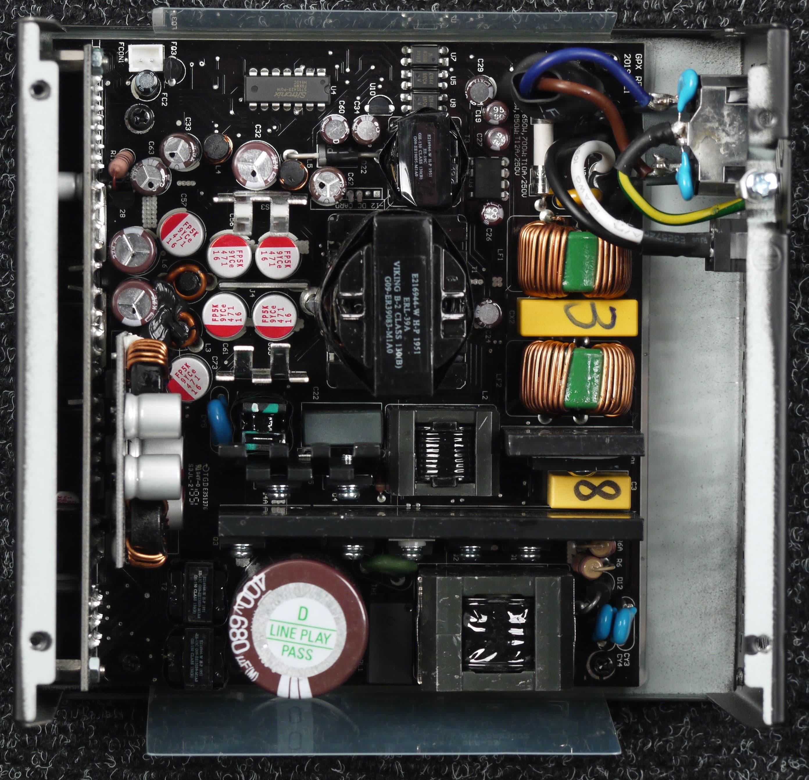 Высоковольтные силовые элементы установлены на одном радиаторе средних размеров, транзисторы синхронного выпрямителя установлены с оборотной стороны основной печатной платы, элементы импульсных преобразователей каналов +3.3VDC и +5VDC размещены на дочерней печатной плате, установленной вертикально и, по традиции, дополнительных теплоотводов не имеют — это вполне типично для блоков питания с активным охлаждением.