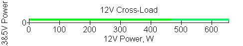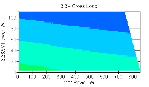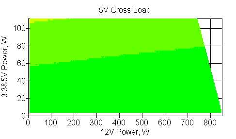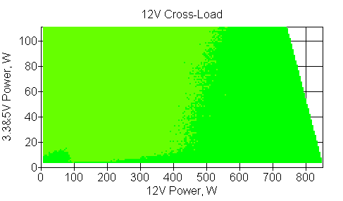 Следующим этапом инструментального тестирования является построение кросснагрузочной характеристики (КНХ) и представление ее на четвертьплоскости, ограниченной максимальной мощностью по шине 3,3&5 В с одной стороны (по оси ординат) и максимальной мощностью по шине 12 В с другой (по оси абсцисс). В каждой точке измеренное значение напряжения обозначается цветовым маркером в зависимости от отклонения от номинального значения.