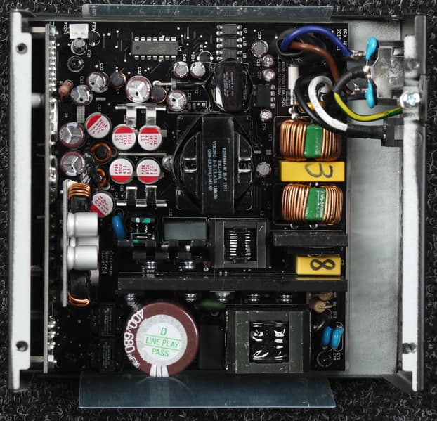 Конструкция блока питания вполне соответствует современным тенденциям: активный корректор коэффициента мощности, синхронный выпрямитель для канала +12VDC, независимые импульсные преобразователи постоянного тока для линий +3.3VDC и +5VDC.
