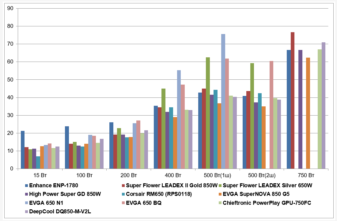 При дальнейшем увеличении выходной мощности уровень шума заметно повышается, и при нагрузке в 750 Вт он приближается к значению 40 дБА при условии настольного размещения, то есть при расположении блока питания в ближнем поле по отношению к пользователю. Подобный уровень шума можно охарактеризовать как повышенный.