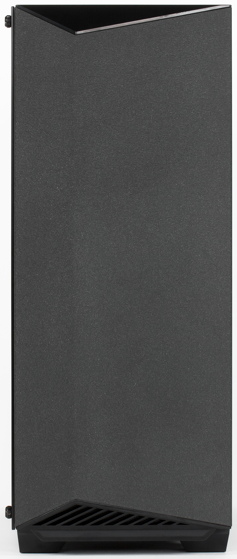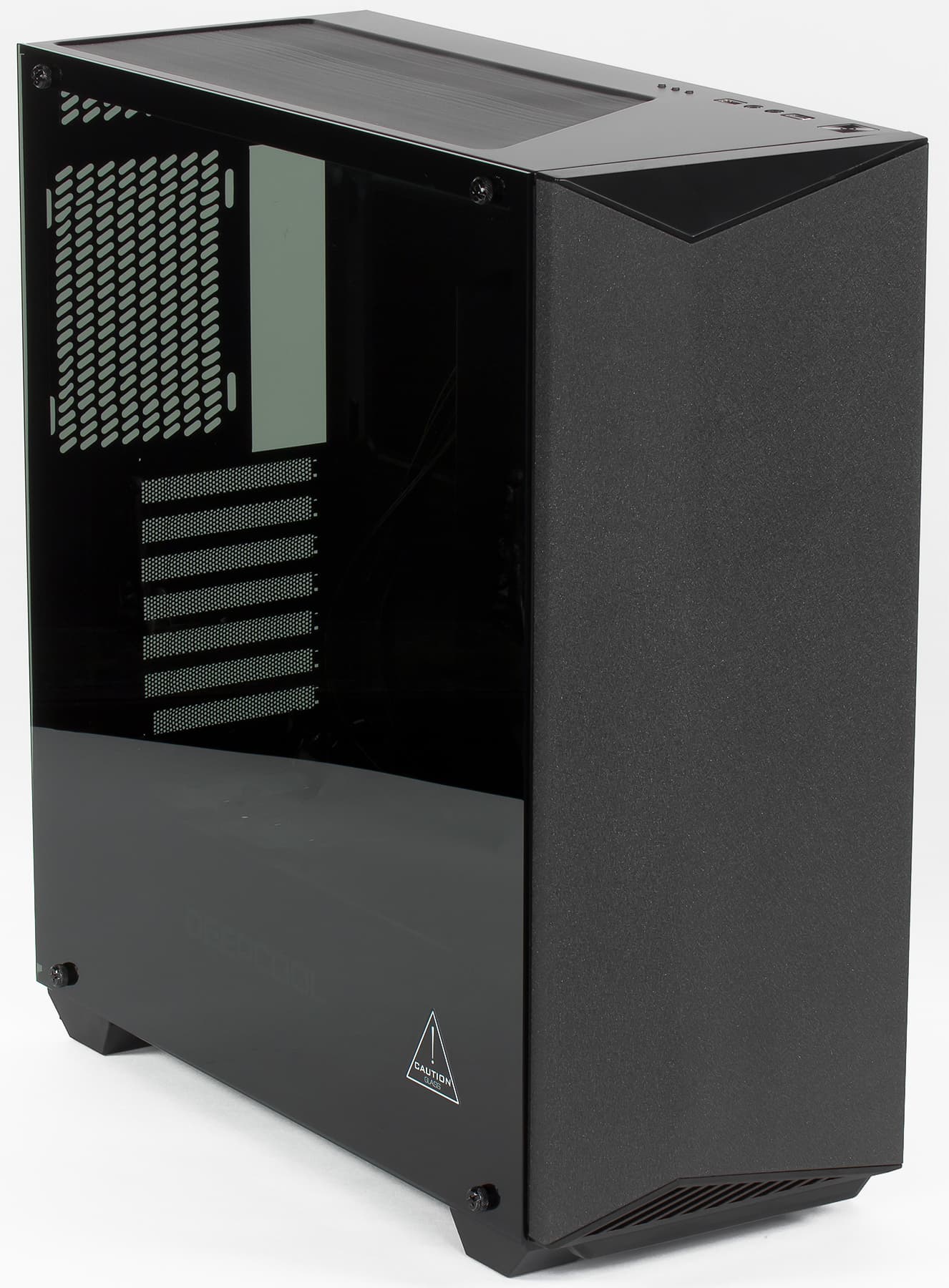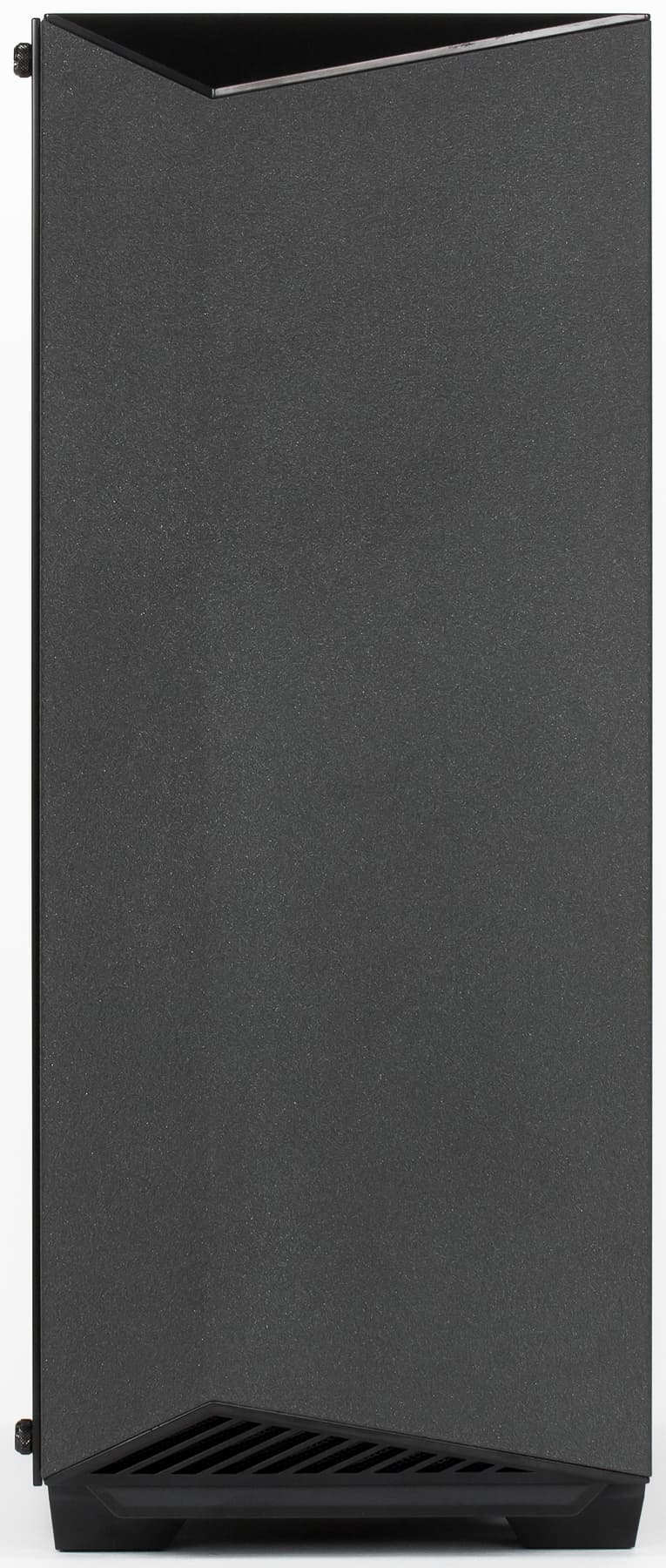 Крепление стеклянной боковой стенки вполне обычное для корпусов такого типа: на нижней и верхней левых кромках шасси есть по две небольшие стойки, на которые надеты уплотнители с сечением в форме буквы «Т». В углах стекла сделаны отверстия для этих стоек, а закрепляется оно винтами с большими накатными головками.