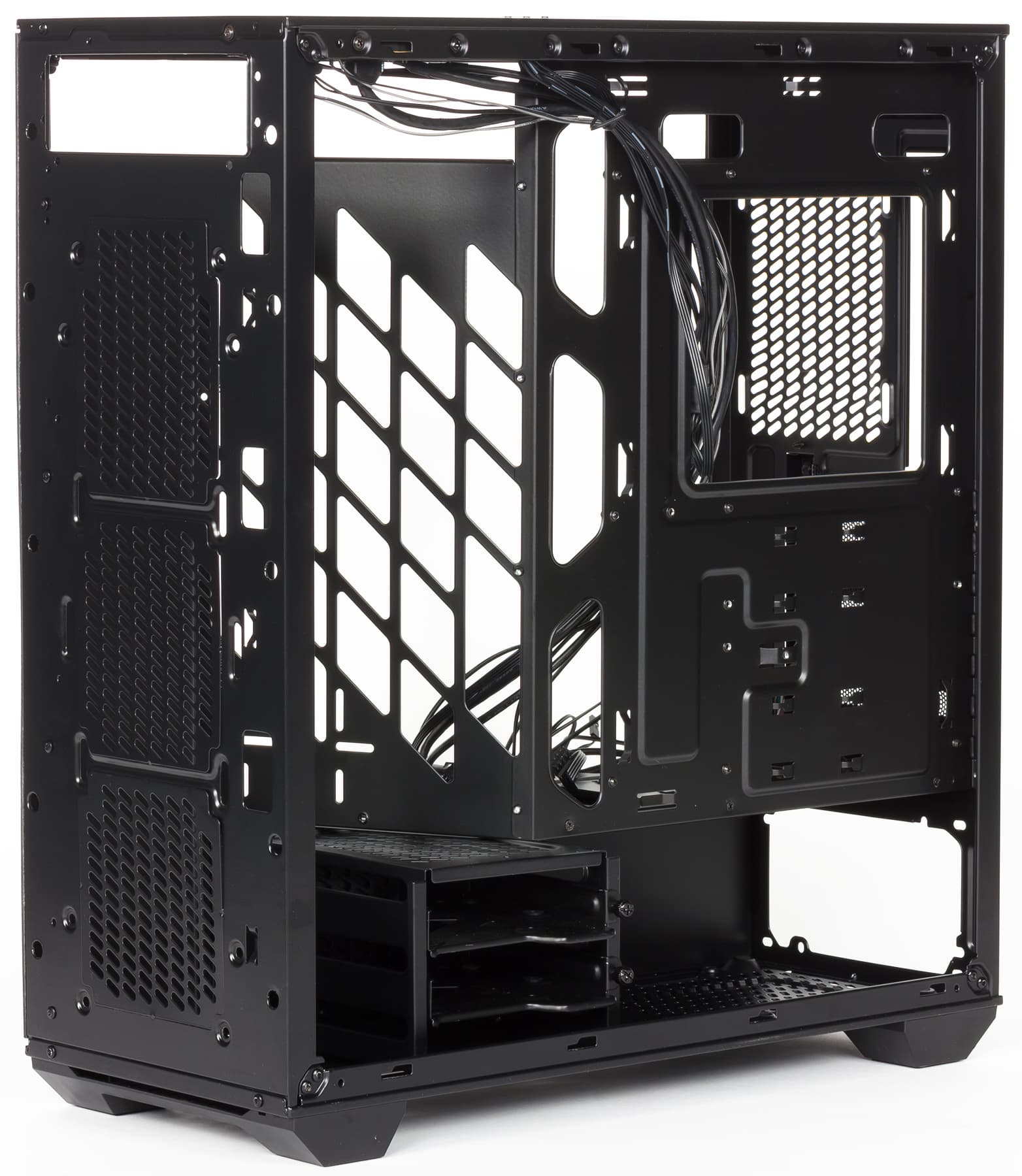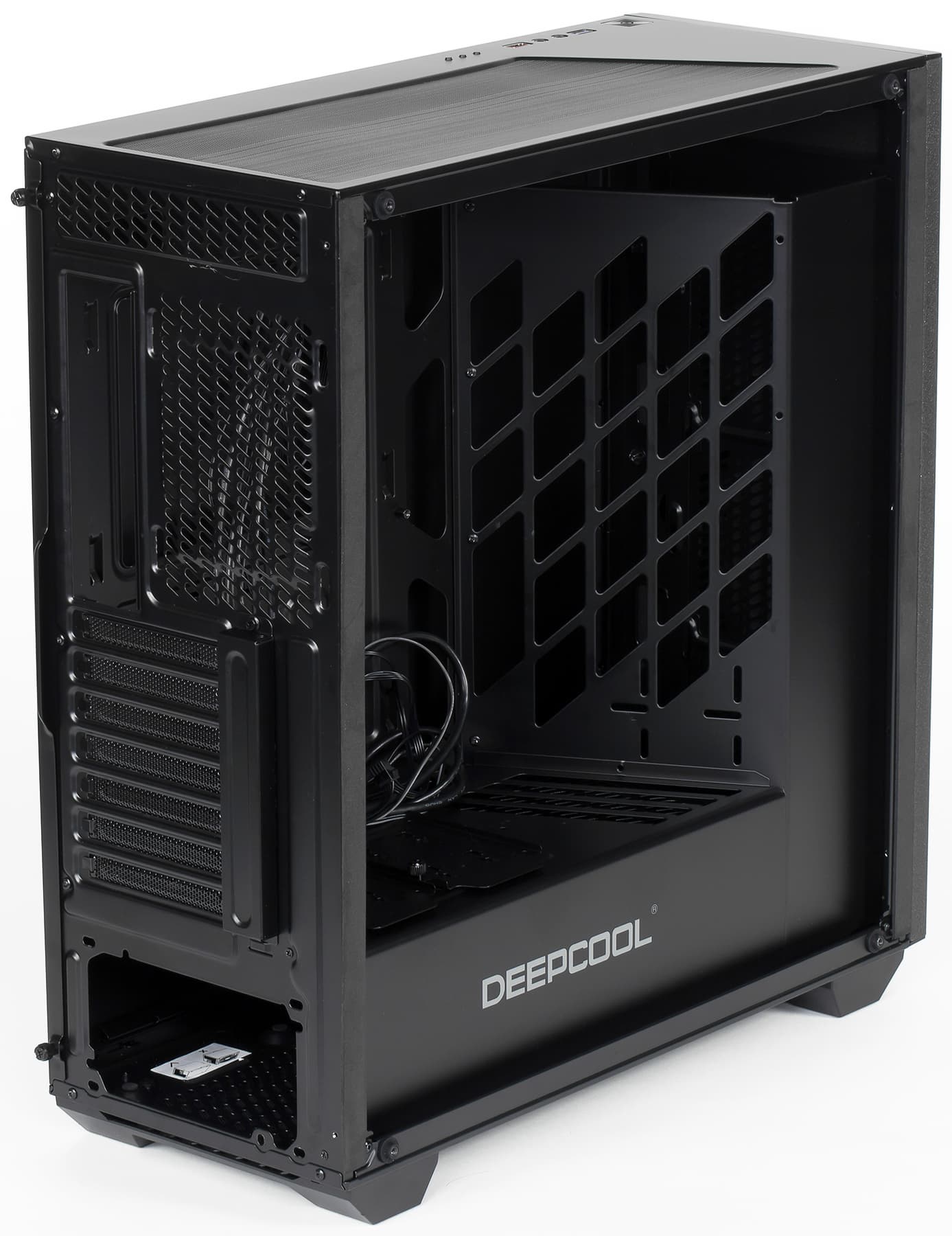 Отверстий для прокладки проводов за основанием пять, резиновых заглушек с разрезными лепестками в них нет: всё же корпус относится к недорогим. Конечно, для кабелей можно использовать и отверстия в решетчатой перегородке, благо они достаточно большие — в них не пройдет разве что разъем питания системной платы.