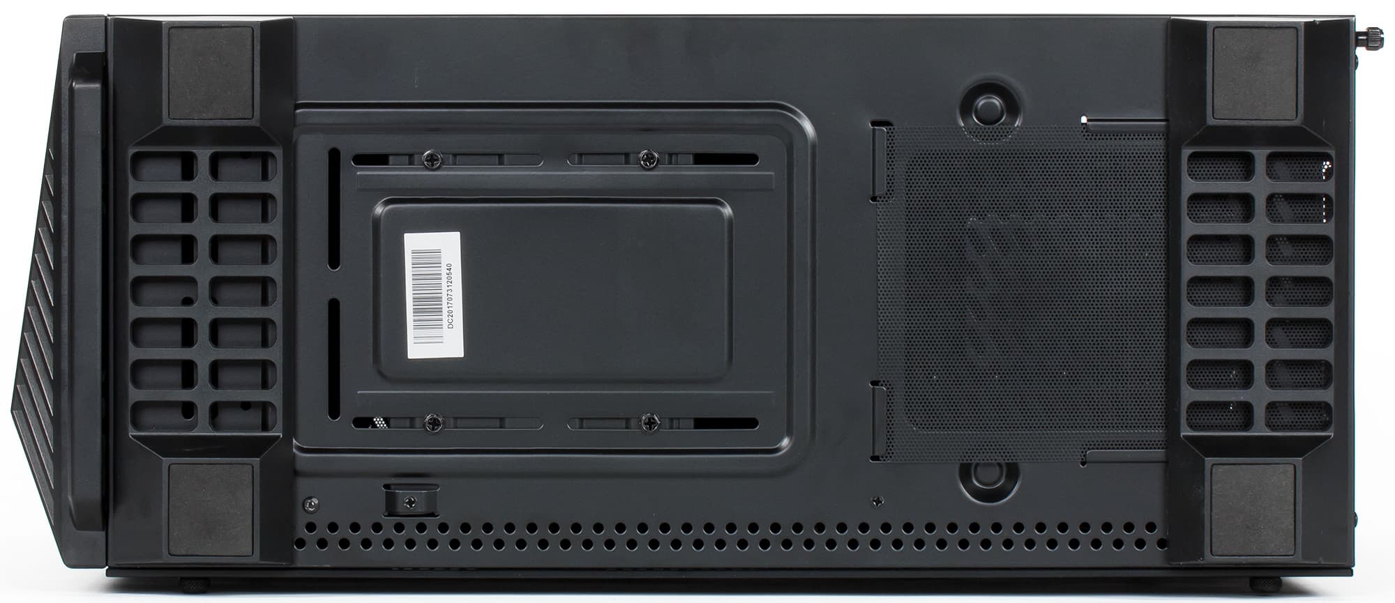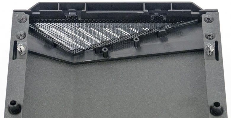 А вот для фронтальных вентиляторов фильтром у тех немногих прорезей, что имеются в нижнем торце лицевой панели, служит металлическая решетка с небольшими отверстиями. Обычно такая решетка служит элементом декора, но здесь ей придется работать еще и фильтром, вот только эффективность в плане «пылезадержания» будет довольно сомнительной, зато налицо еще большее сокращение эффективного сечения отверстий для подачи воздуха к передним вентиляторам.