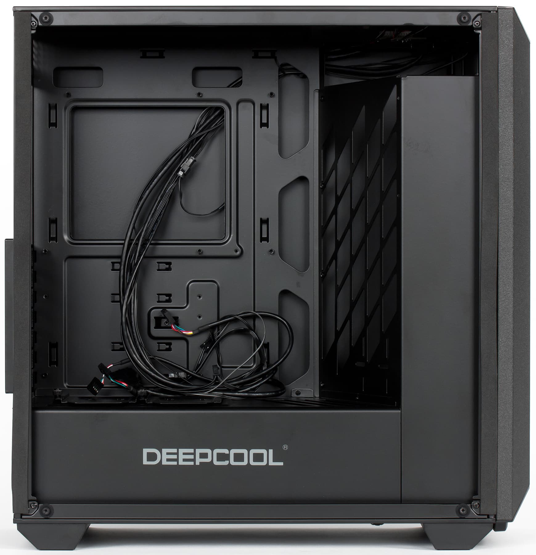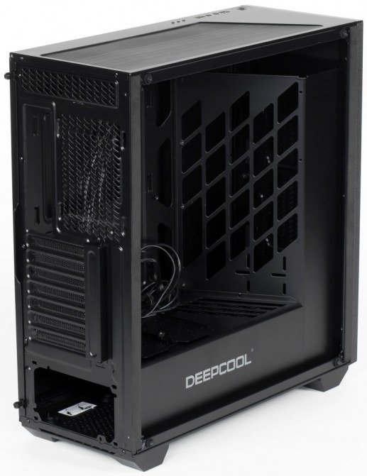Deepcool Earlkase RGB — miditower с нижним расположением блока питания. Внутри он разделен даже не на два, а на три объема; если Г-образная перегородка, отделяющая меньшую по объему нижнюю часть, является делом вполне привычным по очень многим корпусам, то еще одну перегородку — вертикальную и расположенную наискосок ближе к передней стенке — можно считать диковинкой.