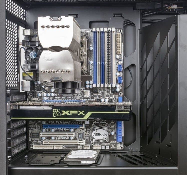 Системная плата крепится на обычные шестигранные стойки, для плат ATX они уже установлены. В основании, на котором размещается плата, имеется большое окно, которое позволит устанавливать и снимать процессорные кулеры без демонтажа самой платы.