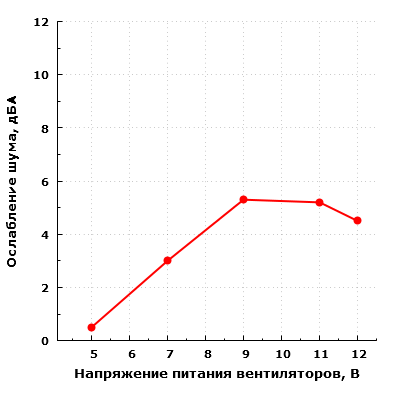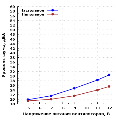 Производительность системы охлаждения корпуса изменяется в относительно широких пределах в зависимости от напряжения питания вентиляторов. Субъективно этот параметр позволяет оценить уровень шума, который находится в диапазоне от 20,3 до 35 дБА при снятой передней панели. В собранном корпусе уровень шума системы охлаждения изменяется от 19,8 до 30,5 дБА при расположения микрофона в ближнем поле. При питании вентиляторов напряжением 5 В шум находится на очень низком уровне, однако с ростом напряжения питания уровень шума несколько возрастает. В типовом диапазоне регулирования напряжения 7—11 В шум изменяется от минимально заметного (21,5 дБА) до пониженного (28,3 дБА) уровня относительно типичных значений для жилых помещений в дневное время суток. Впрочем, даже при питании вентиляторов номинальным напряжением 12 В уровень шума системы охлаждения весьма далек от пороговых 40 дБА и находится в комфортном диапазоне для большинства пользователей. При большем удалении корпуса от пользователя и размещении его, к примеру, на полу под столом, шум можно будет охарактеризовать как минимально заметный при питании вентиляторов от 5 В, а при питании вентиляторов от 12 В — как приближающийся к пониженному для жилого помещения в дневное время суток.