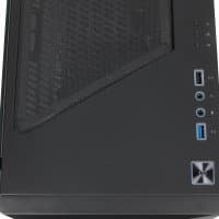 Органы на панели следующие: впереди большая квадратная кнопка Power, затем порт USB 3.0, пара аудиоразъемов, порт USB 2.0 и три кнопки, управляющие подсветкой. Кнопка Reset отсутствует. Такое расположение портов USB позволит одновременно подключать к ним широкие устройства, но в некоторых случаях может быть затруднен доступ к звуковым гнездам.