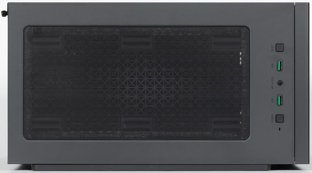 Корпус представляет собой решение башенного типа с вертикально размещаемой платой формата microATX (и менее габаритной) и горизонтальным расположением блока питания снизу.
