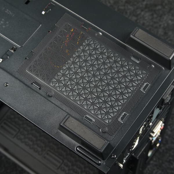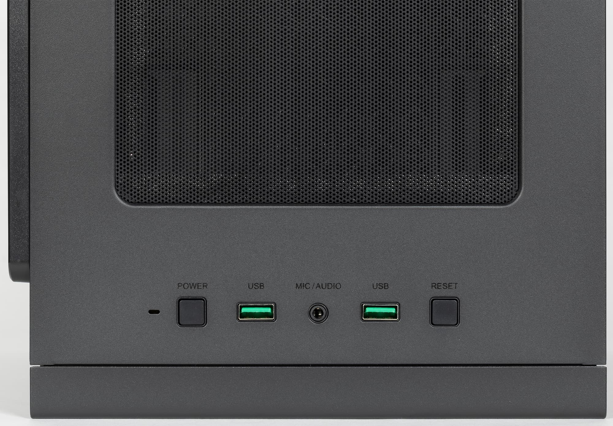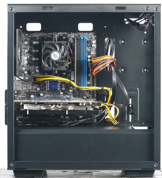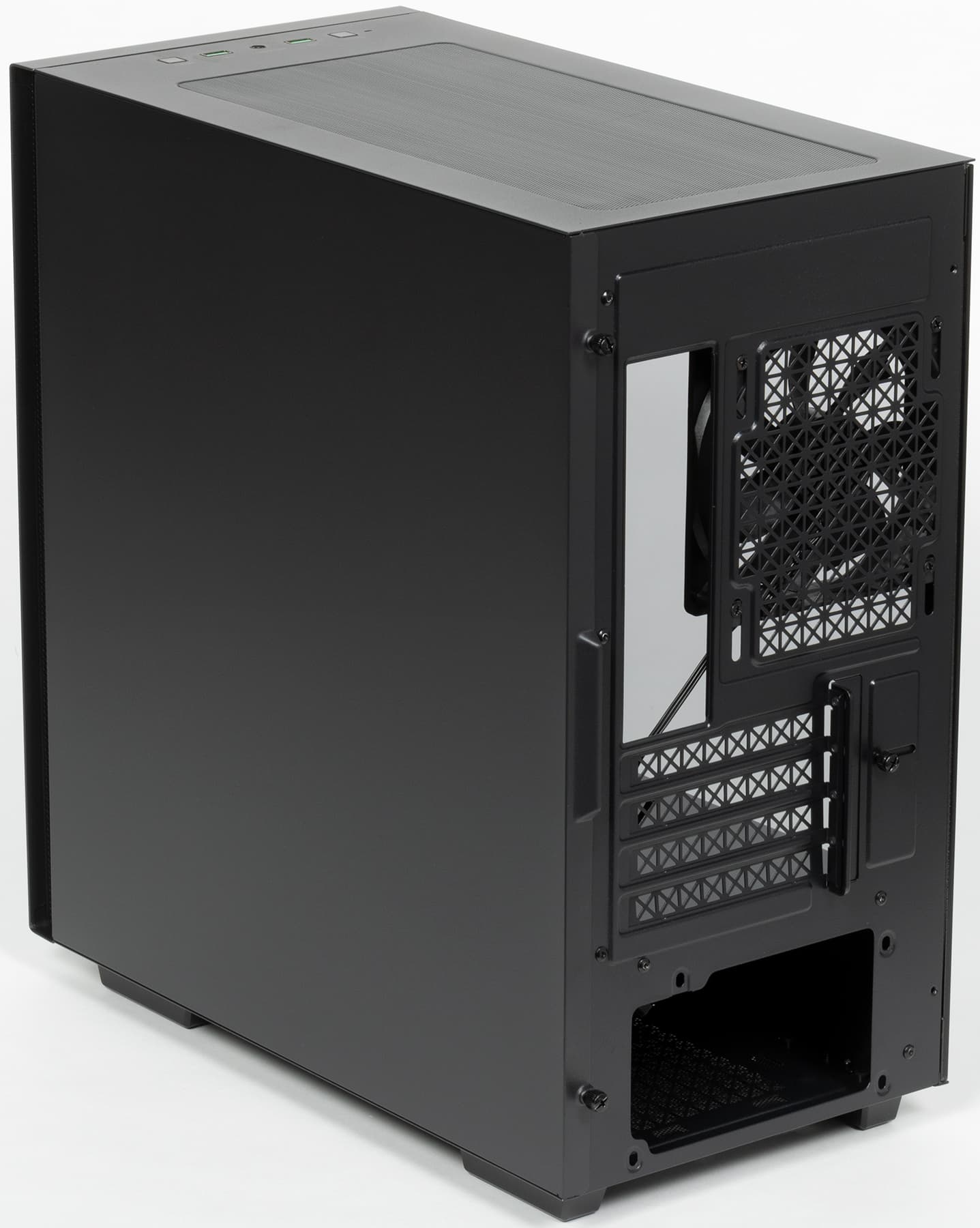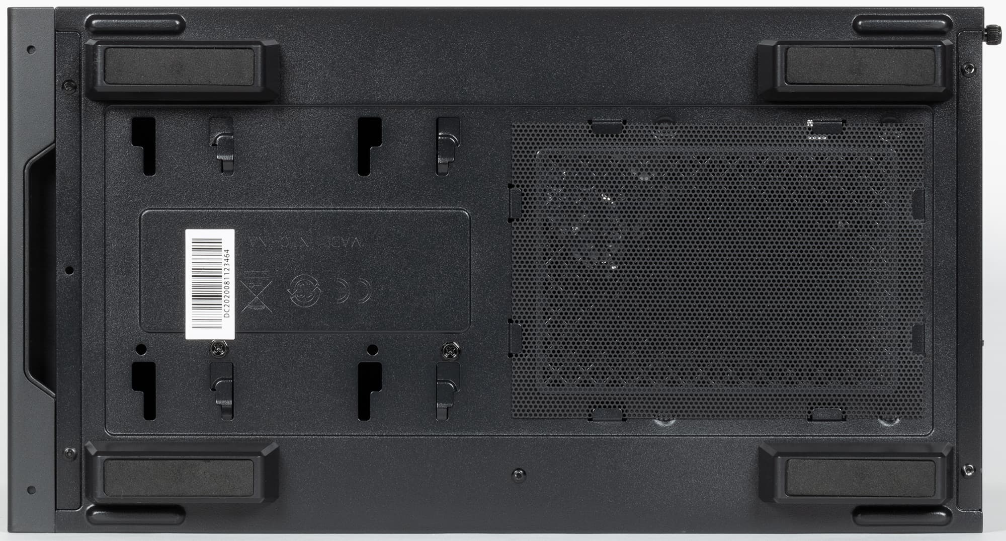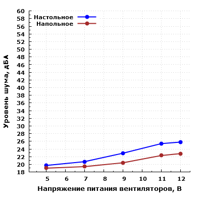 Уровень шума и при напольном, и при настольном размещении корпуса очень низкий во всем диапазоне регулирования напряжения вентиляторов (от 5 до 12 вольт). Но достигается это из-за того, что в корпусе штатно установлен лишь один низкоскоростной вентилятор сзади. Для большинства недорогих конфигураций этого будет вполне достаточно, особенно с учетом наличия верхнего выхлопа. При сборке системы с высоким тепловыделением корпус можно оснастить вентилятором сверху, который обеспечит улучшенный теплоотвод, а также можно заменить задний вентилятор — лучше на модель с ШИМ-управлением.