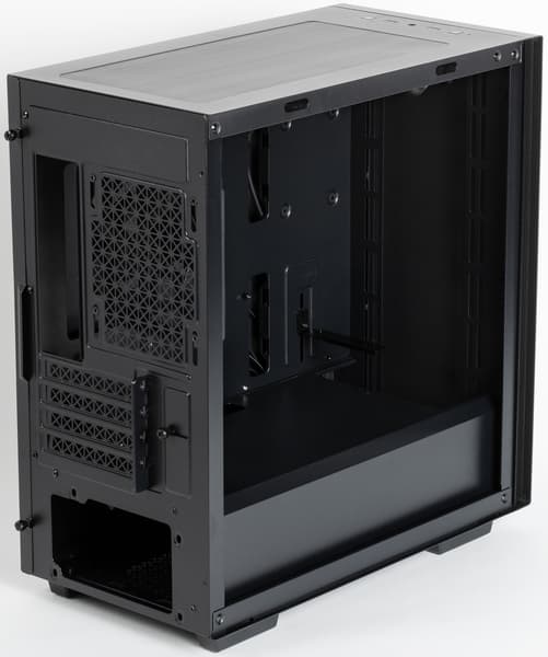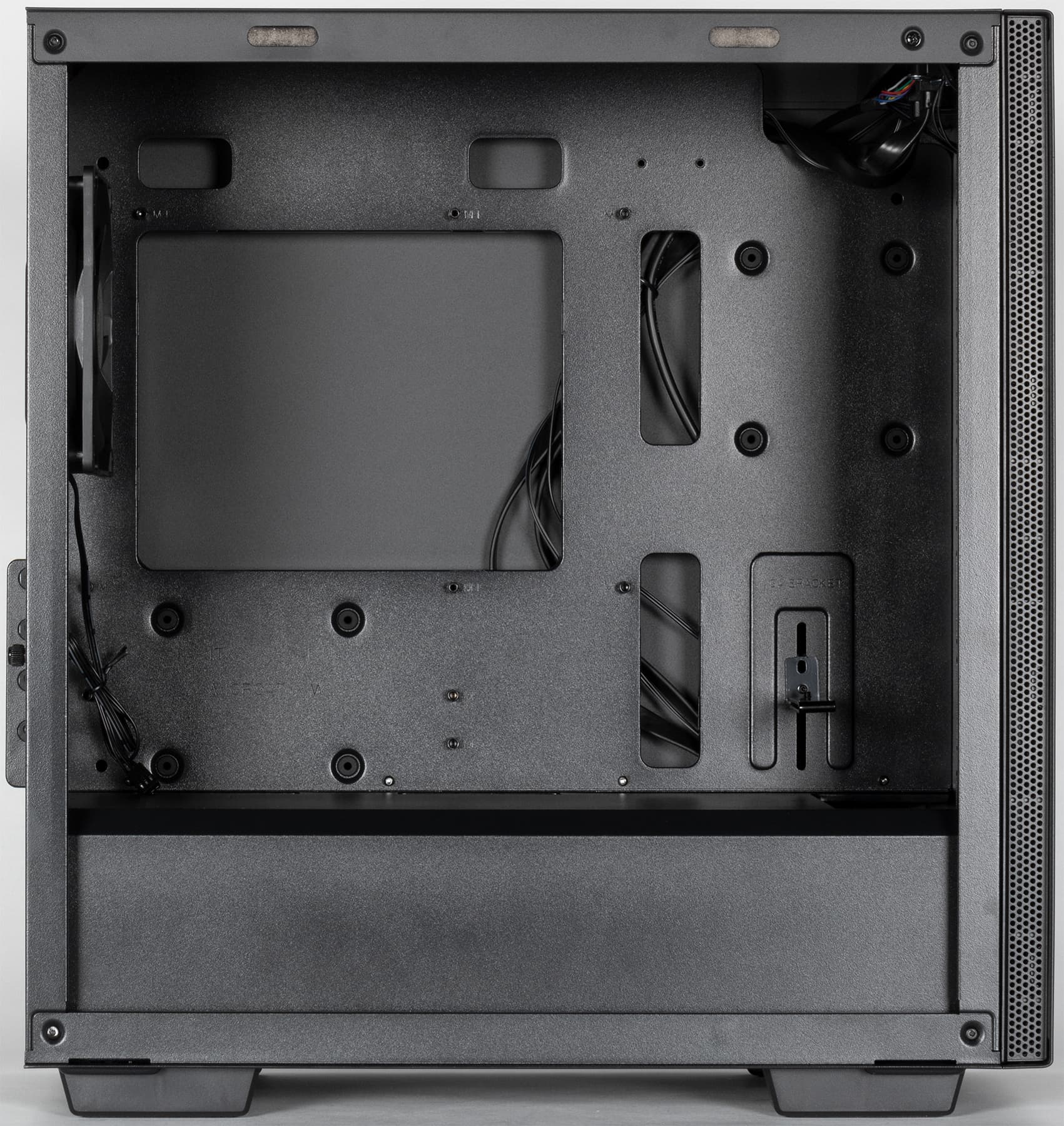 Компоновочные решения данной модели определяются современными тенденциями корпусостроения. В данном случае разработчики отказались от отсека для устройств формата 5,25″, а привычный отсек для устройств 3,5″ расположен около передней стенки шасси, но присутствует он в усеченном виде — всего на два диска. При желании его можно и вовсе снять, открутив винты.