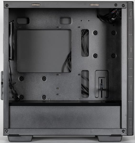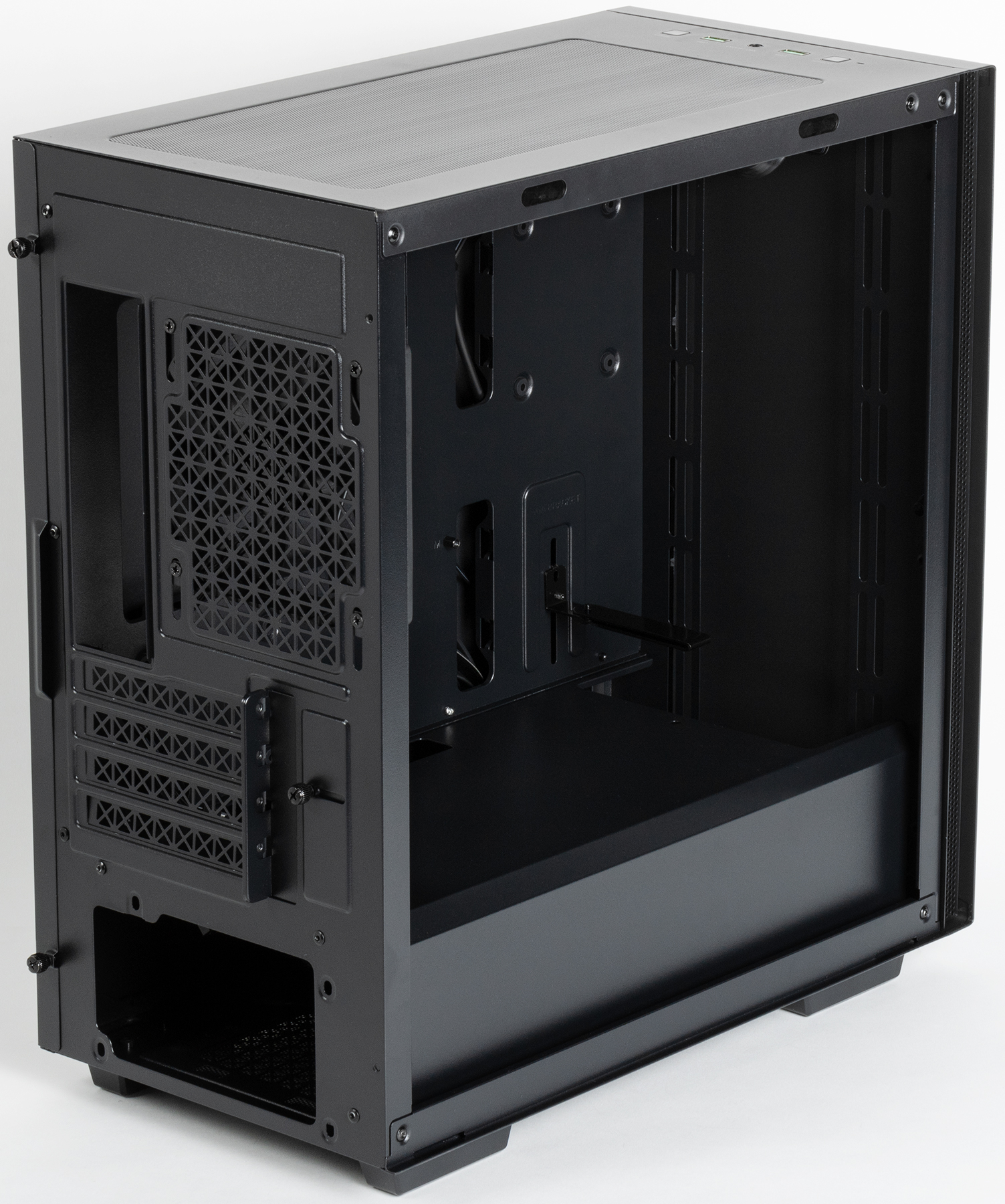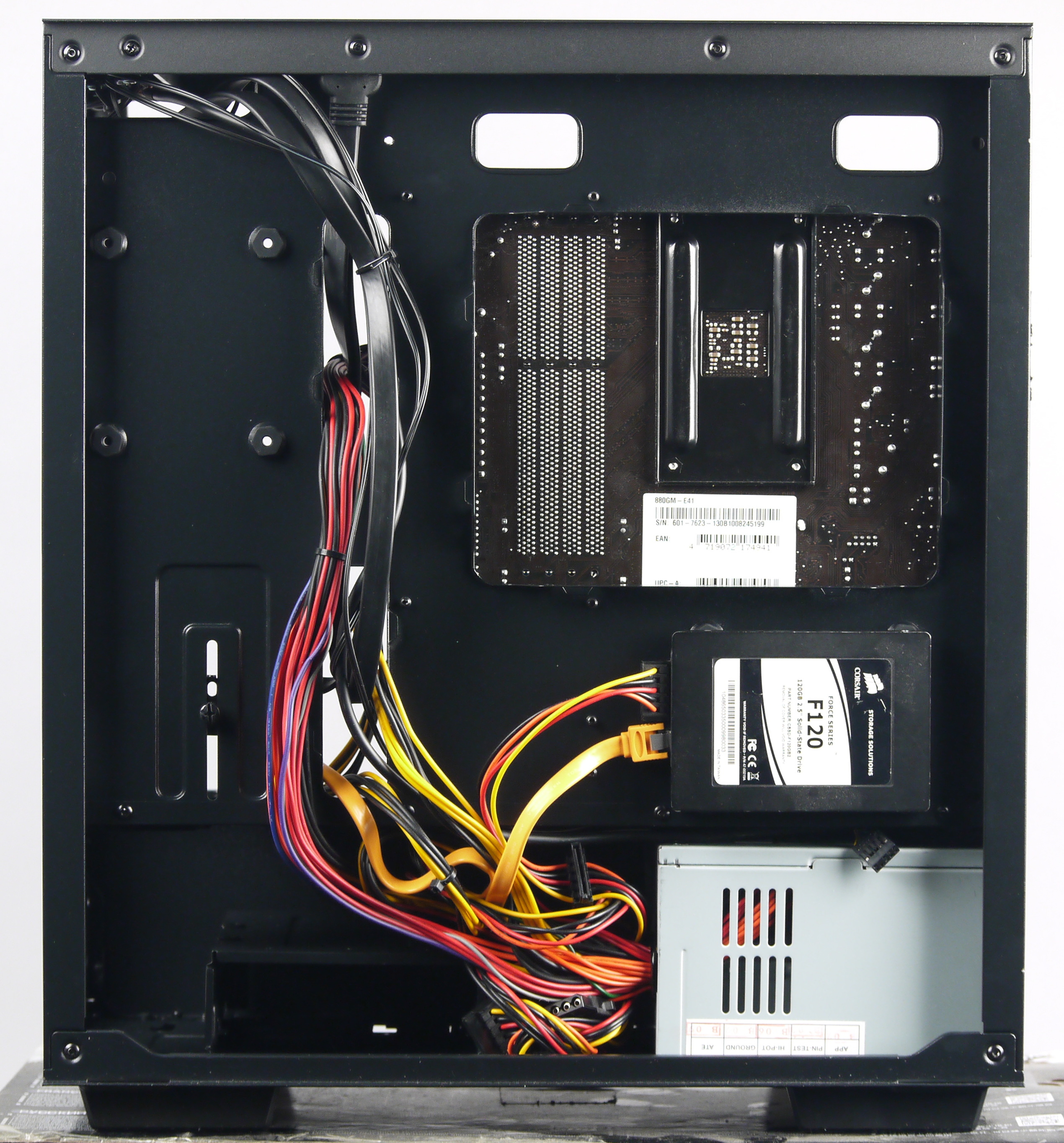 Шасси корпуса явно бюджетное, заметны усилия, направленные на увеличение жесткости конструкции путем использования деталей специальной формы. Однако стали на это ушло не так много, поскольку в элементах имеются большие отверстия и проемы.